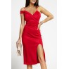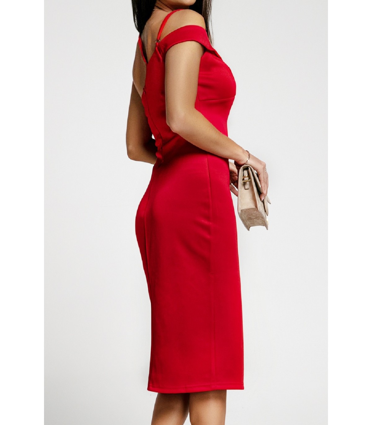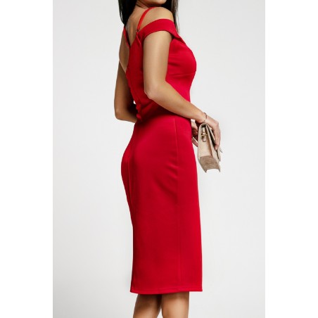 Punainen yksihihainen v-midimekko olkaimilla ja halkiolla