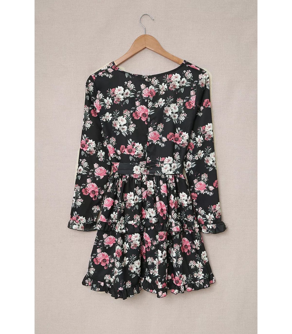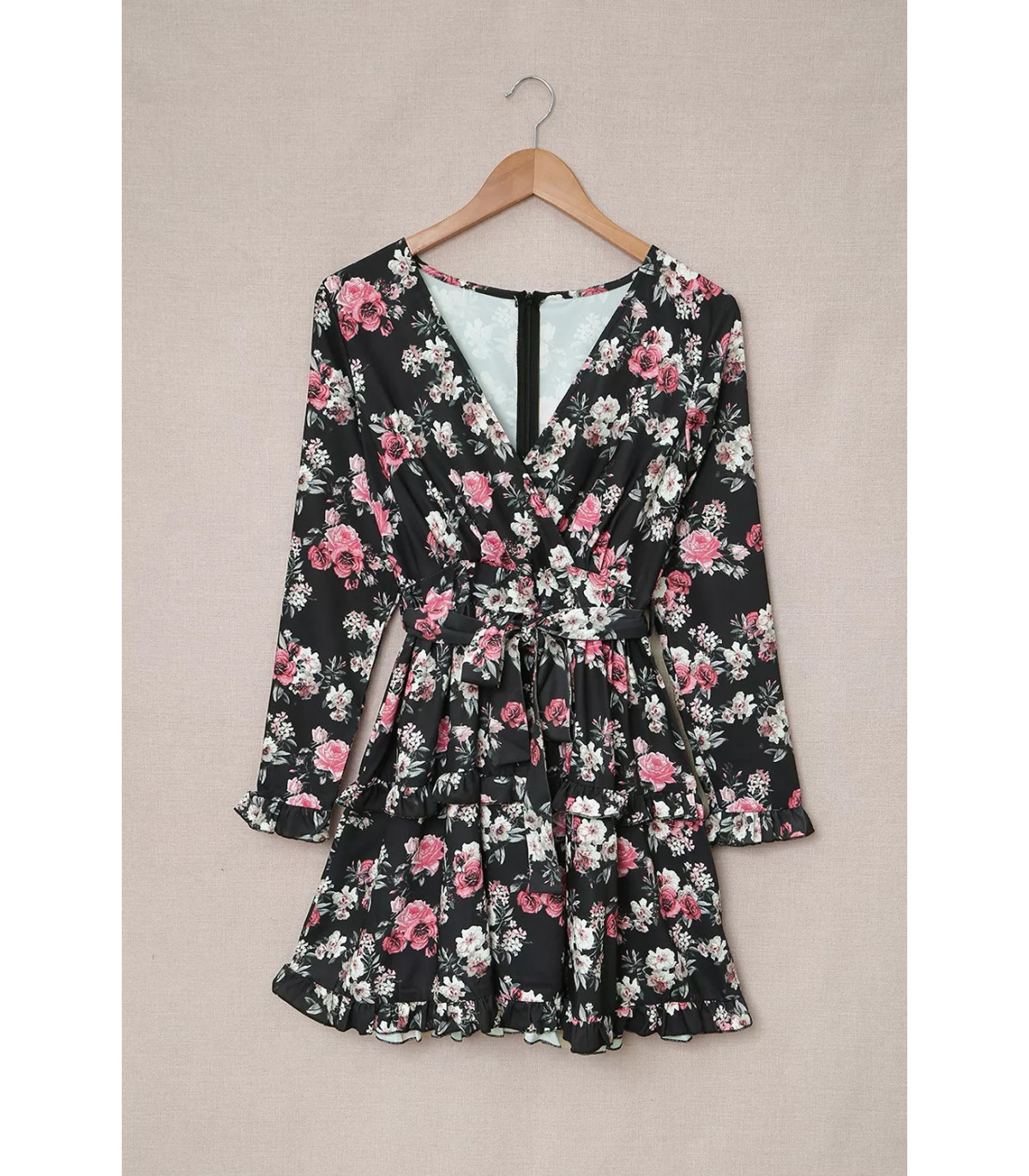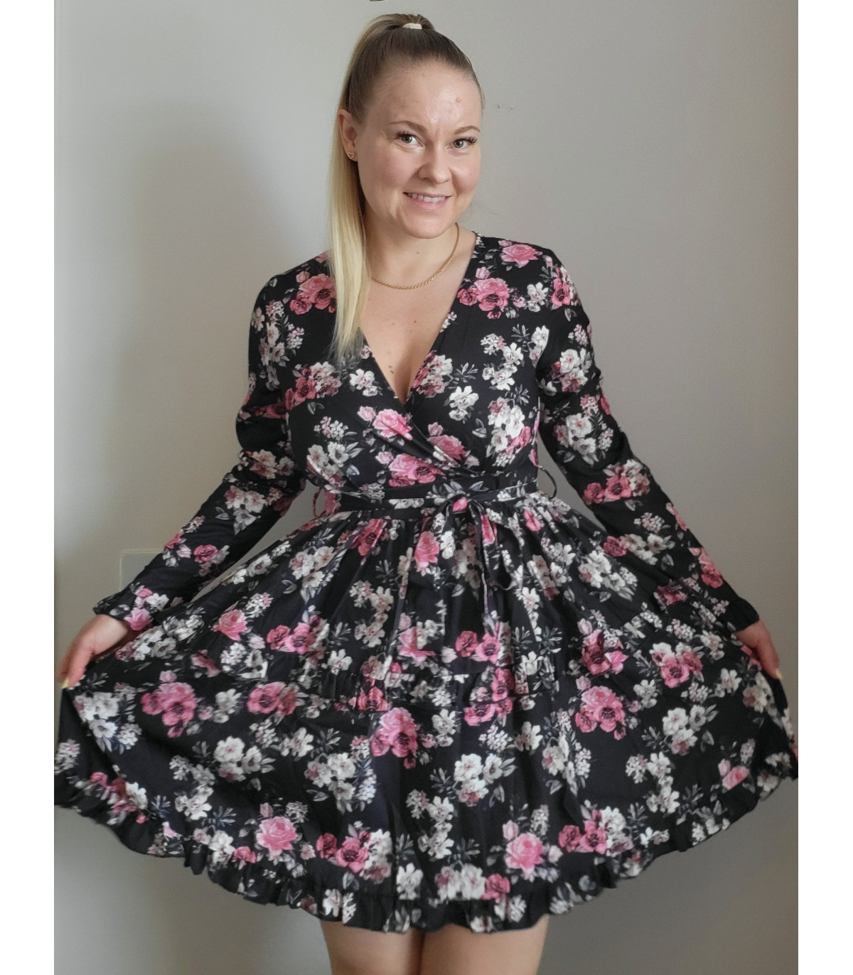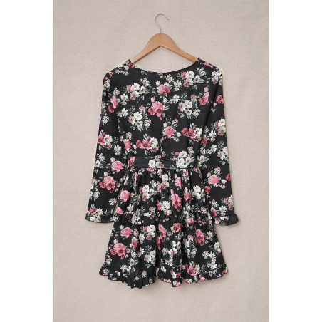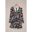 Musta kukkakuvioinen pitkähihainen wrap-look v-mekko