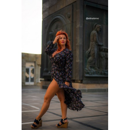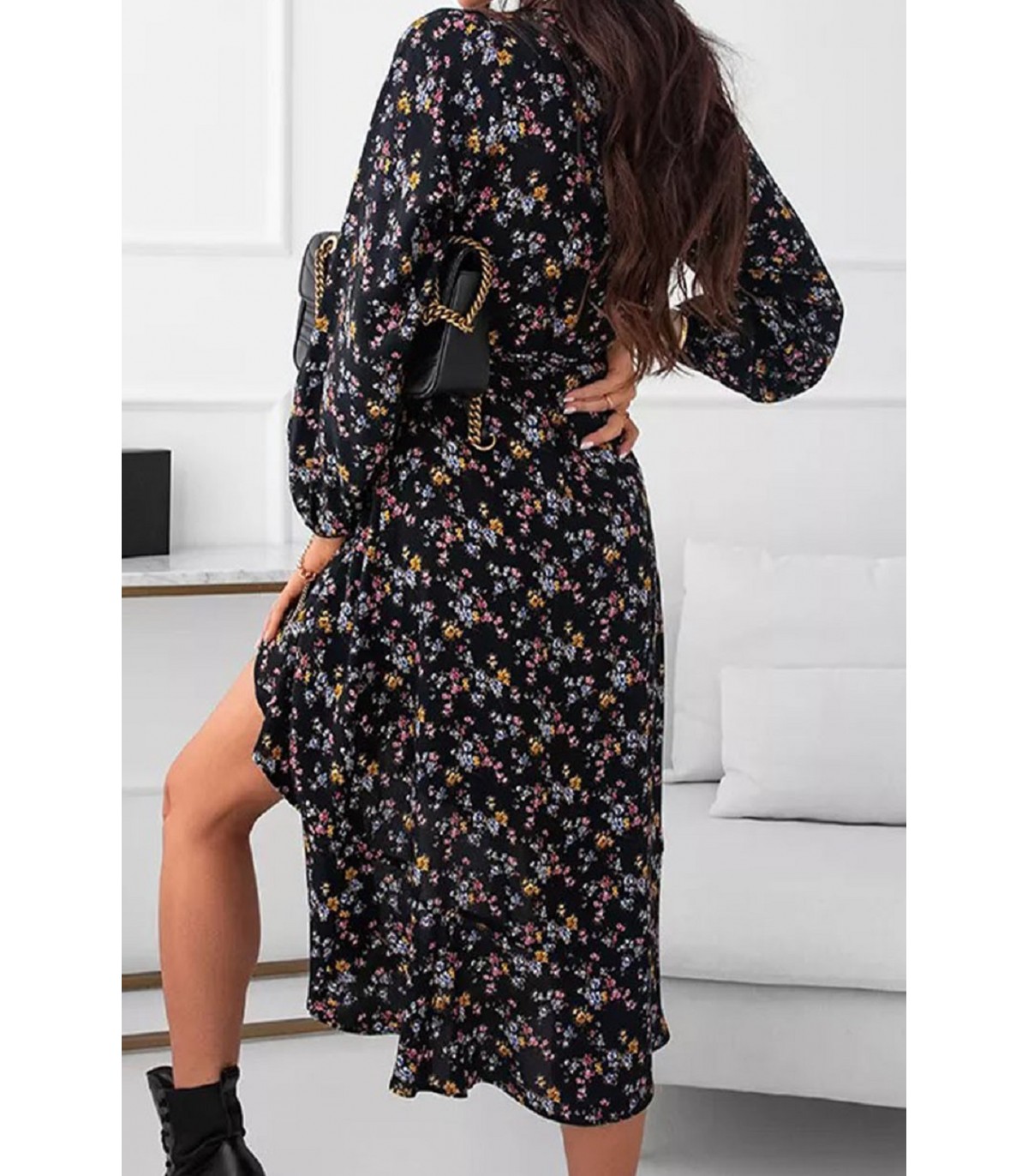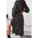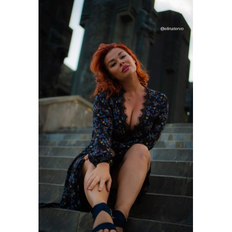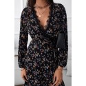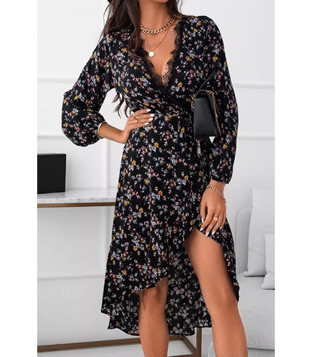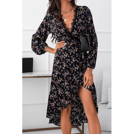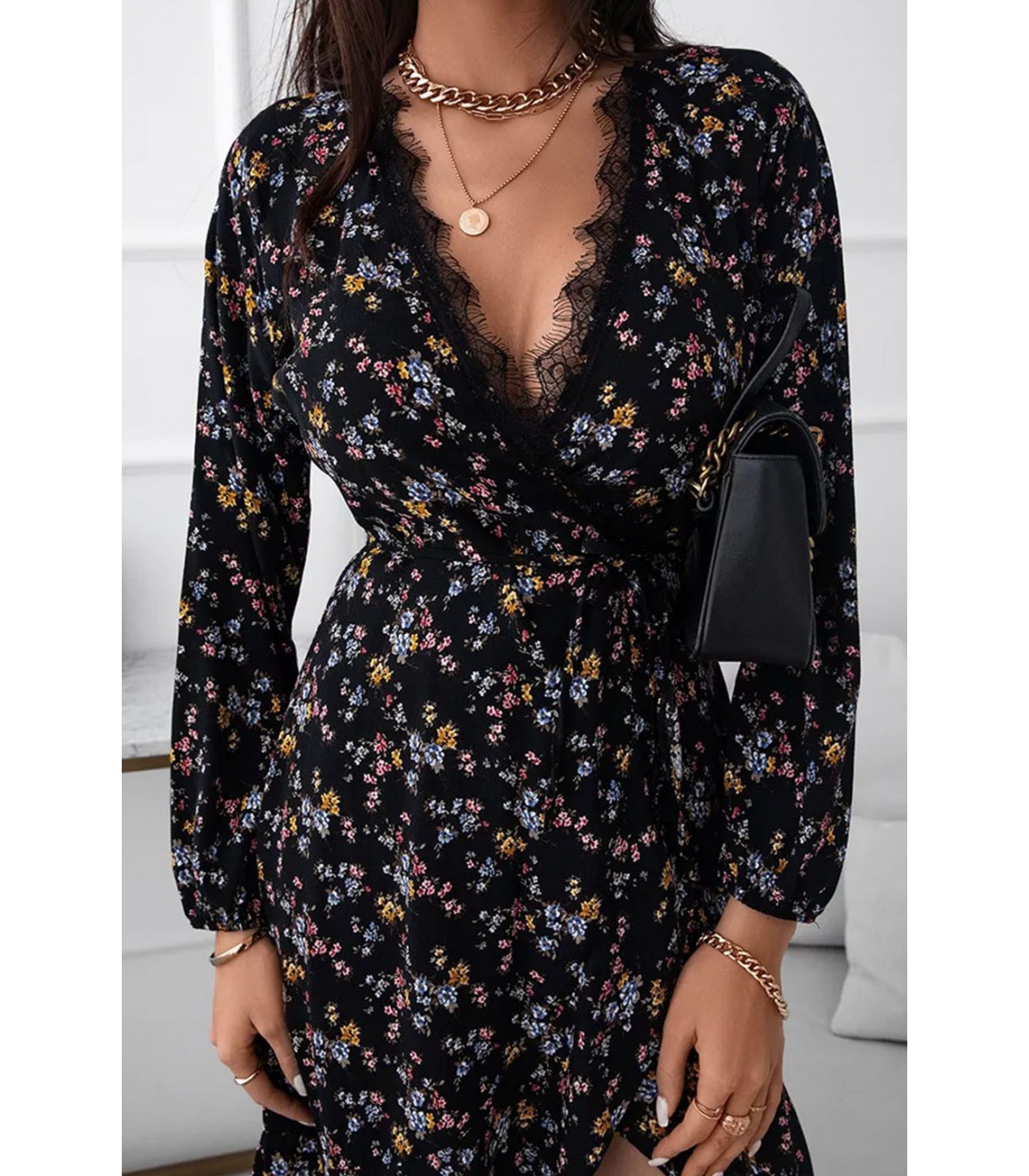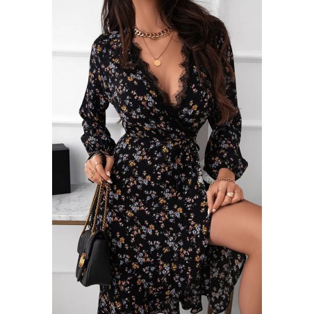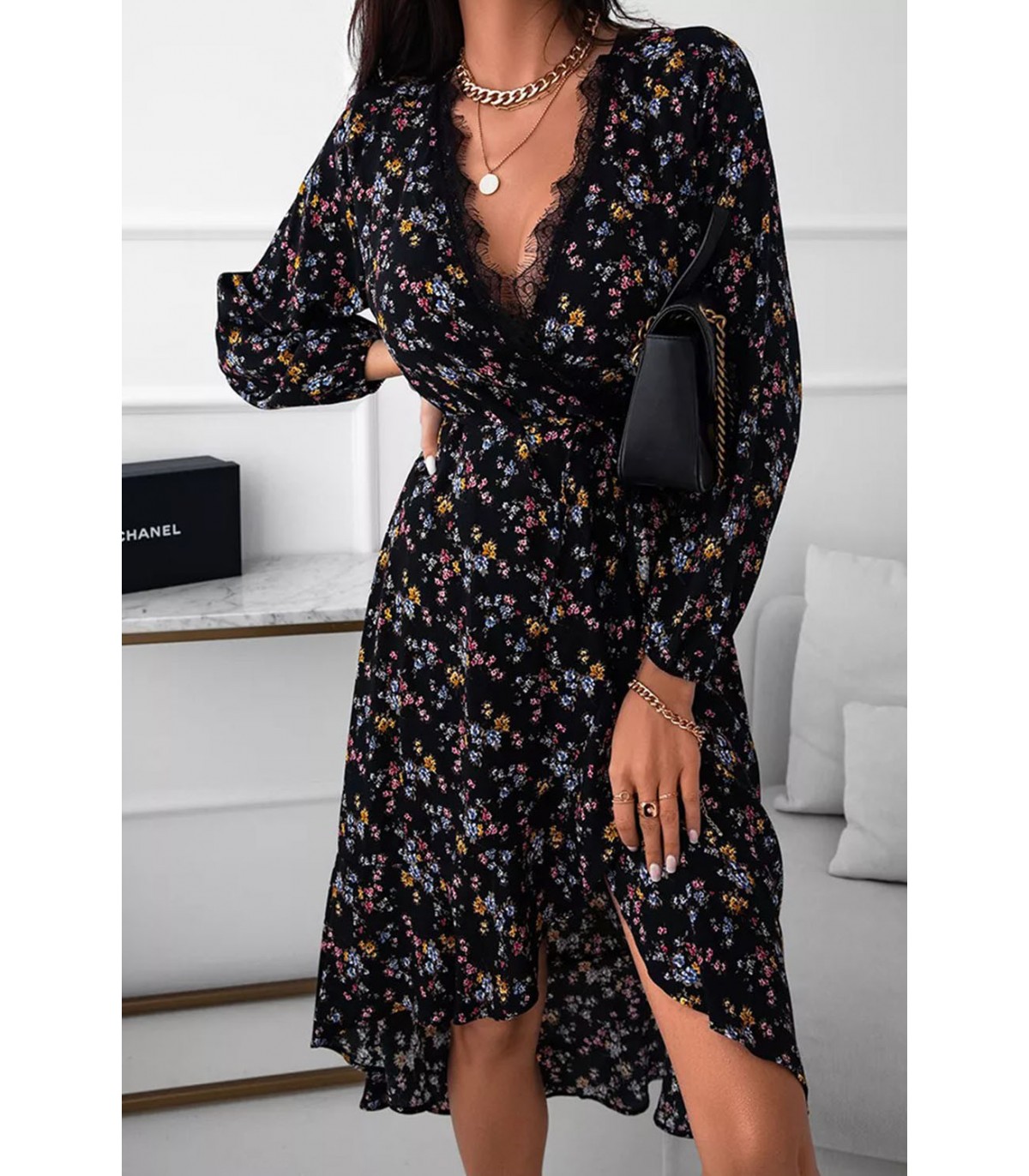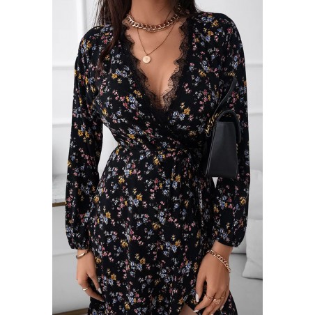 Musta kukkakuvioinen v-wrap-mekko pitsillä