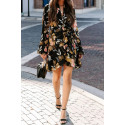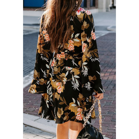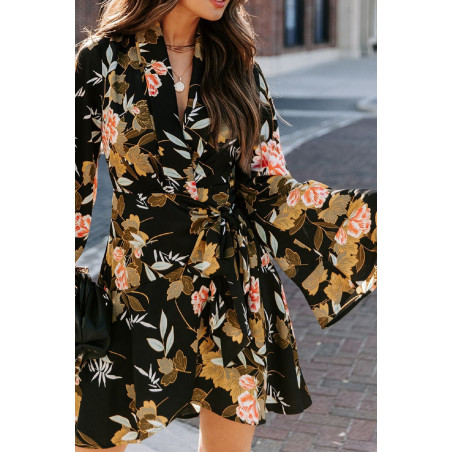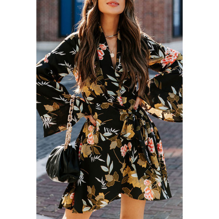 Musta leveähihainen kukka- ja lehtikuvioinen wrap-look v-mekko