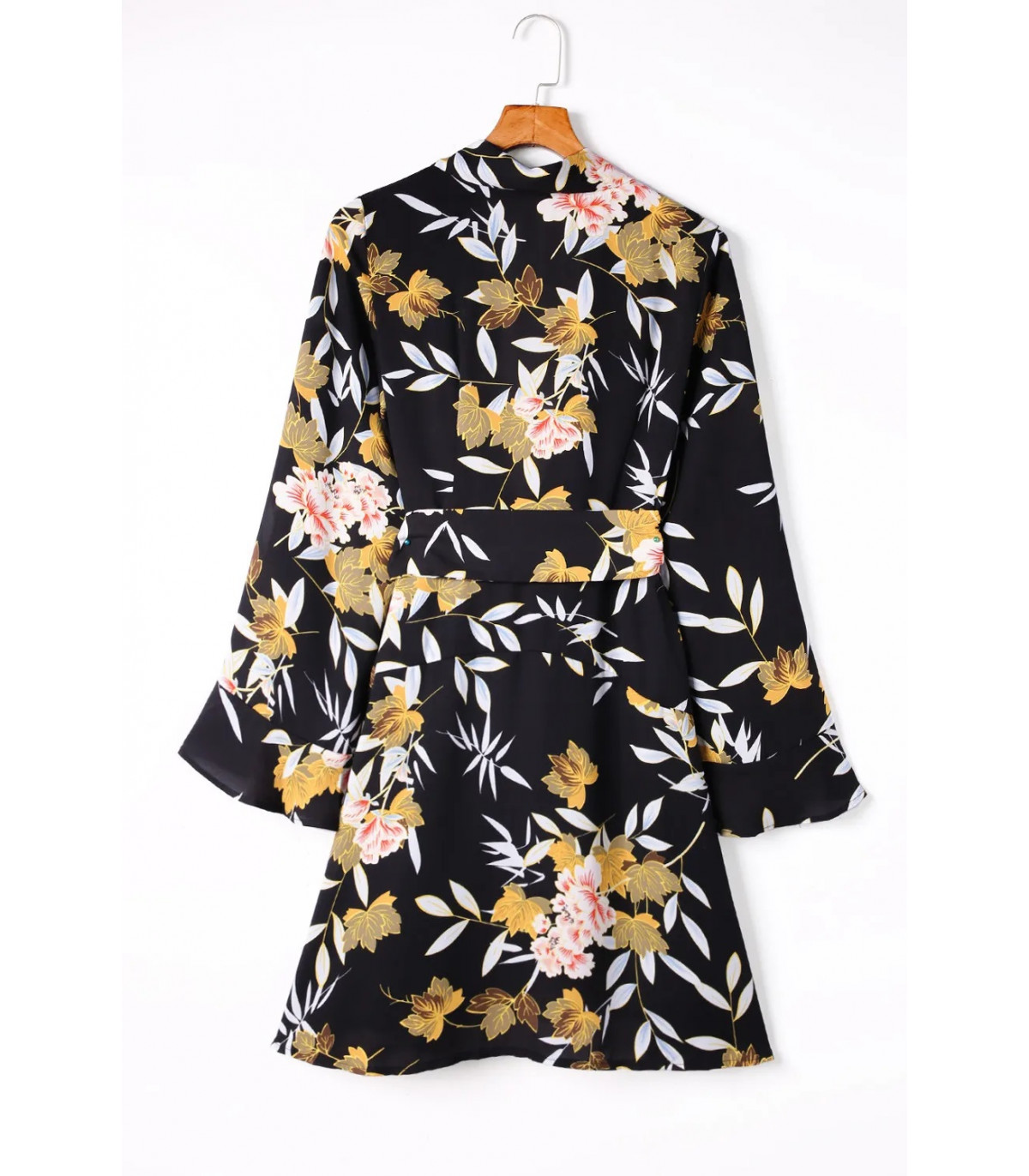 Plus de details Valittu koko loppu varastostaMusta leveähihainen kukka- ja lehtikuvioinen wrap-look v-mekko