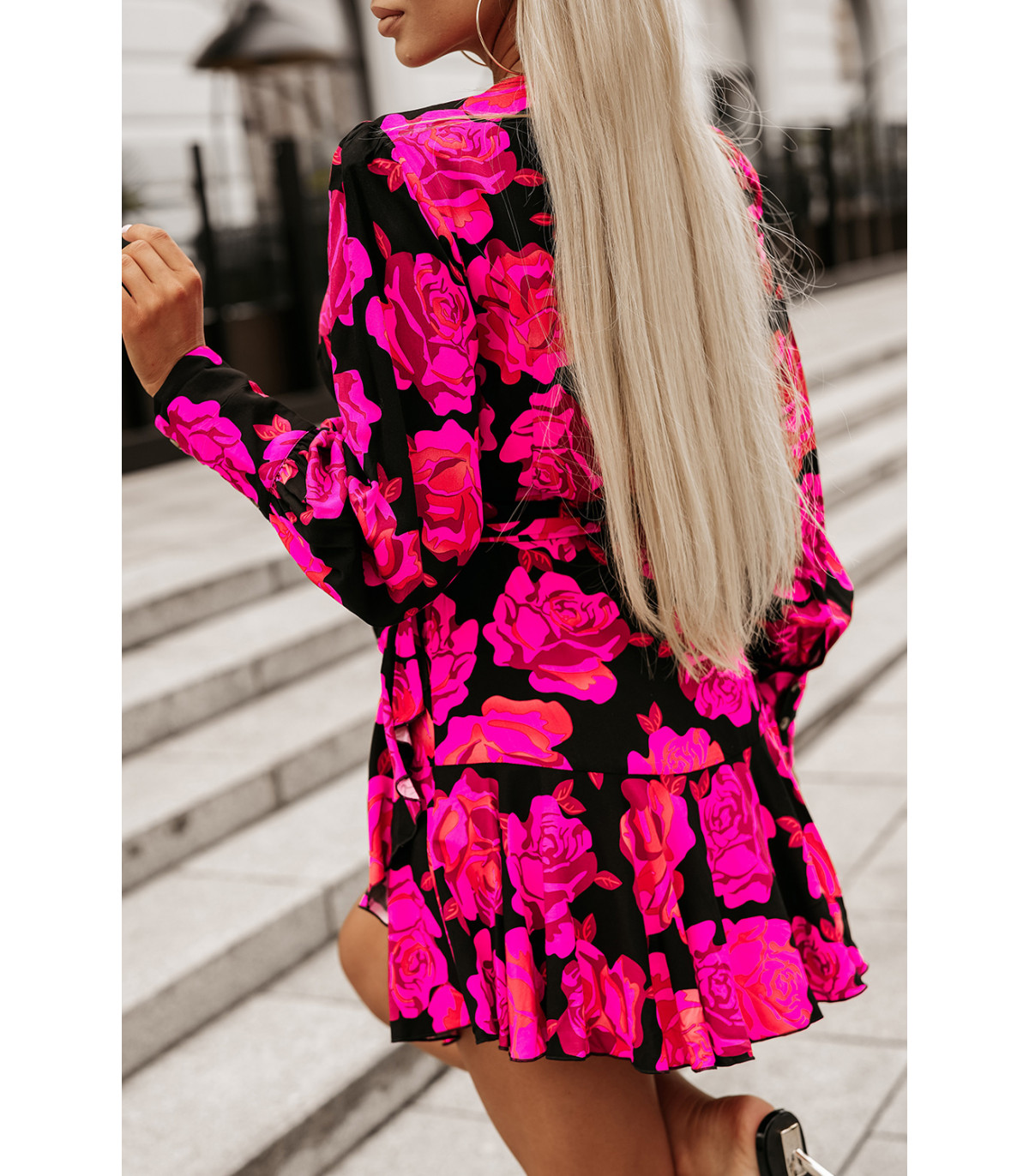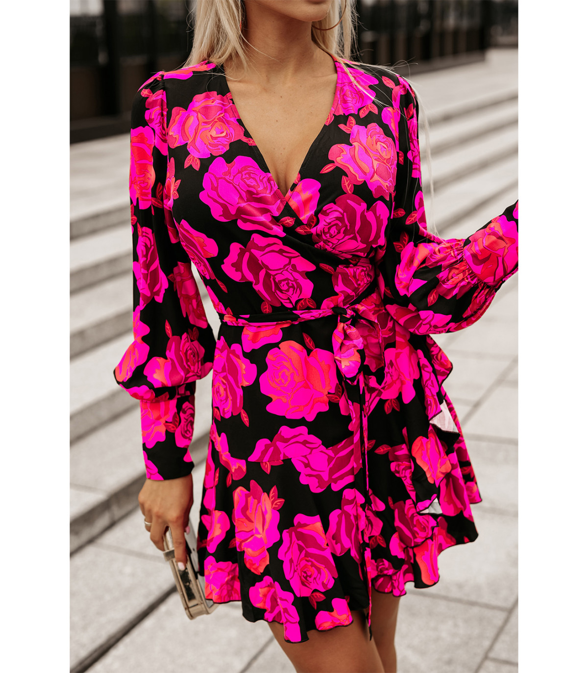 Mustapinkki ruusukuvioinen v-wrap-mekko vyöllä