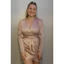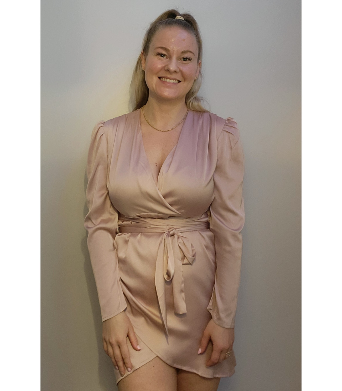 Vaaleanpunertava pitkähihainen wrap-look v-satiinimekko