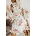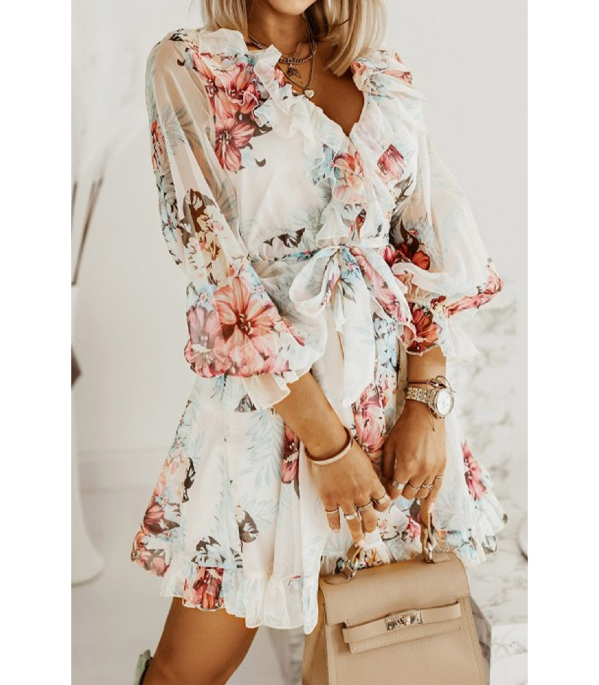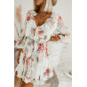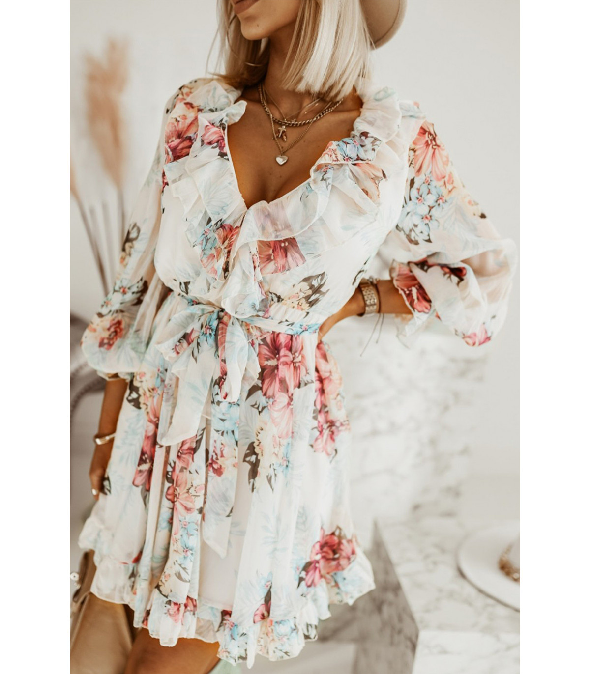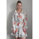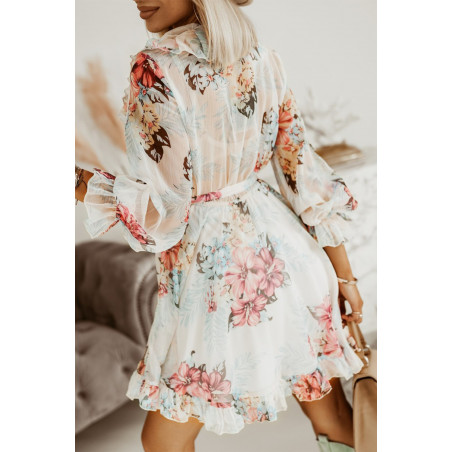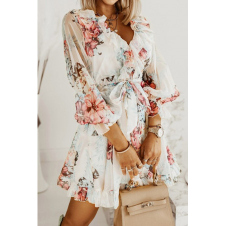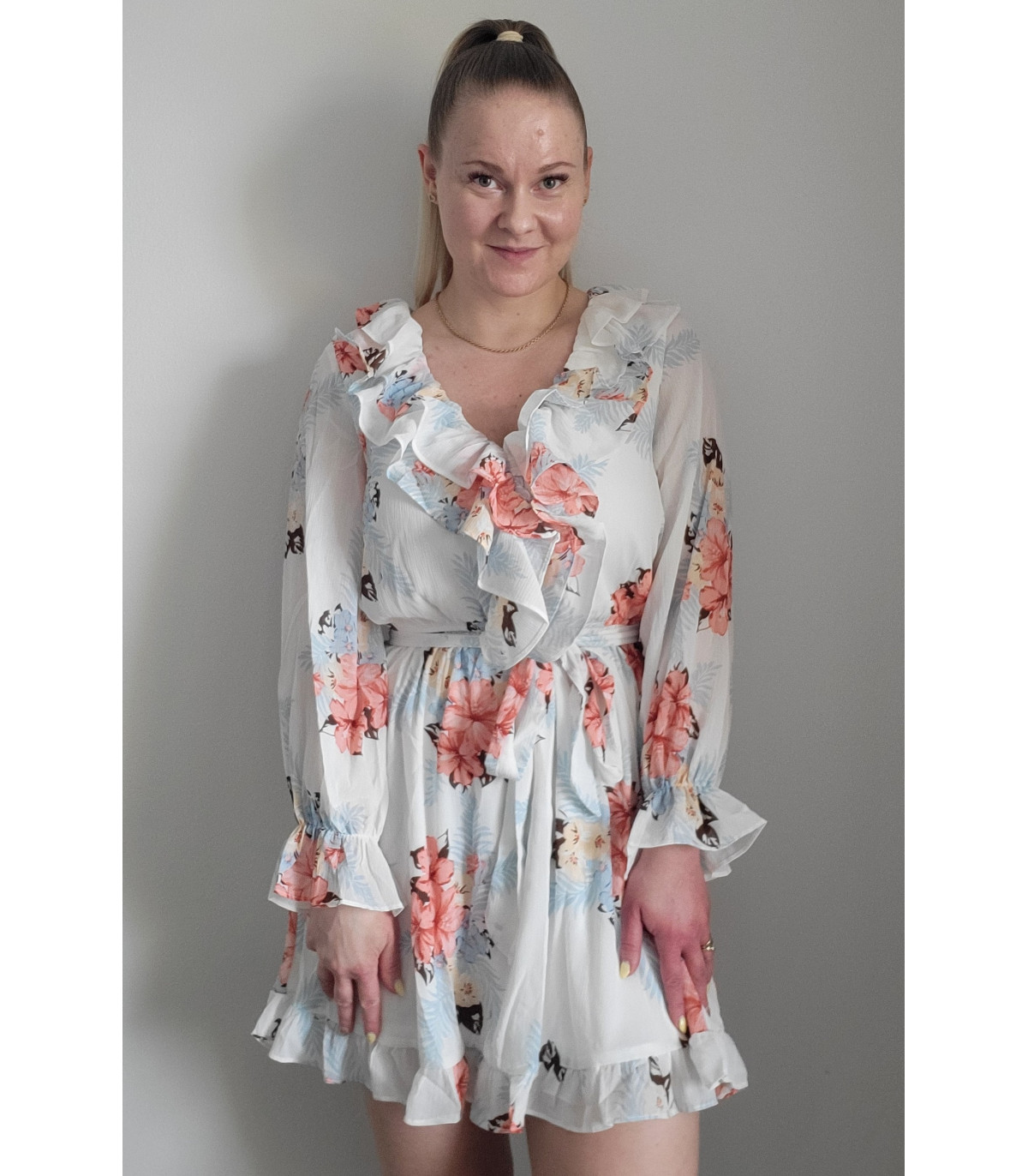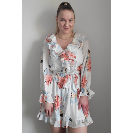 Valkoinen kukkakuvioinen v-röyhelömekko vyöllä