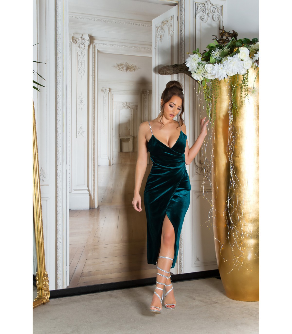 Vihreä samettilook wrap-look v-mekko ketjuolkaimilla