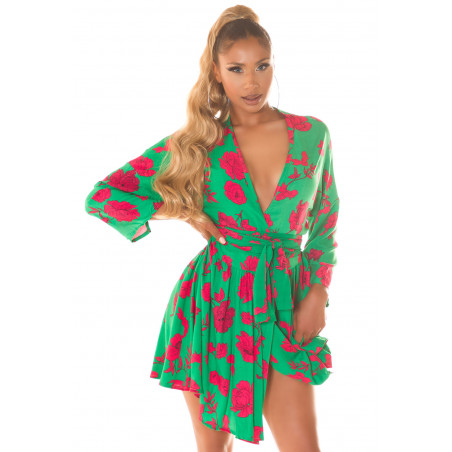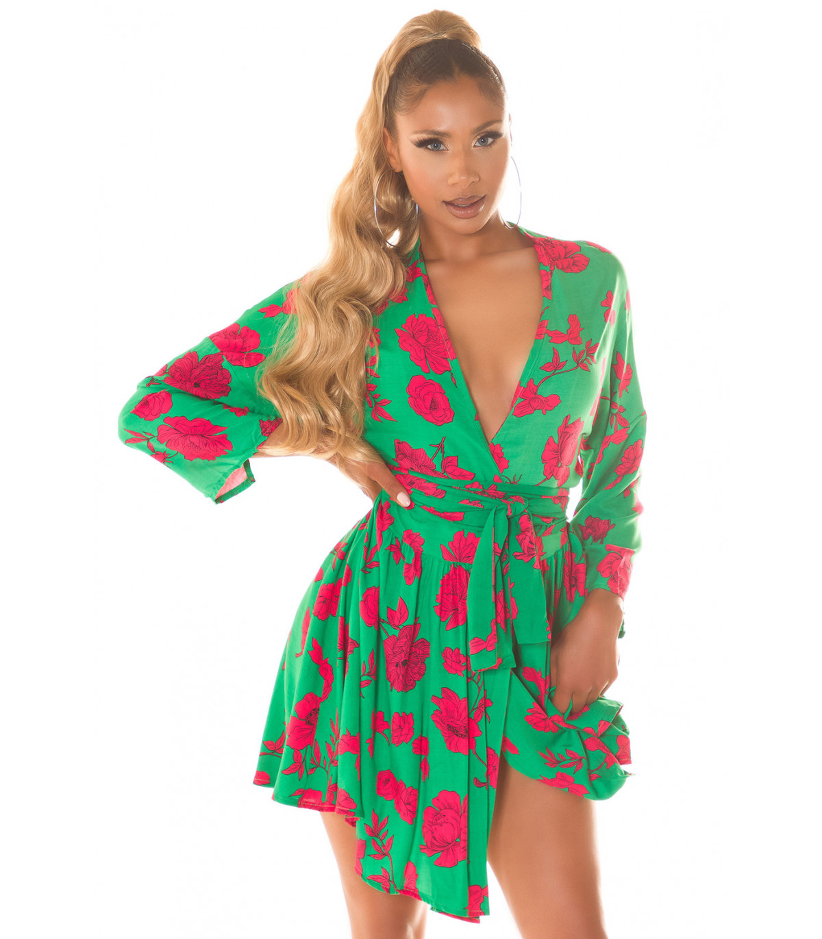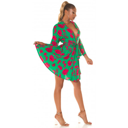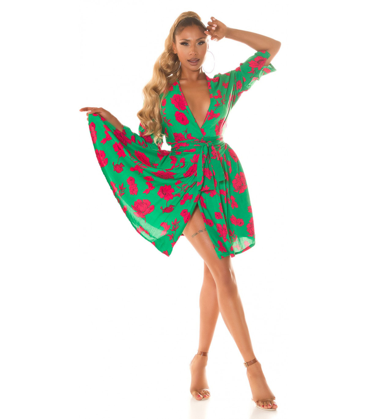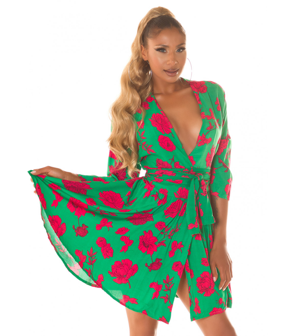 Vihreäpunainen kukkakuvioinen wrap-look v-mekko