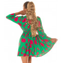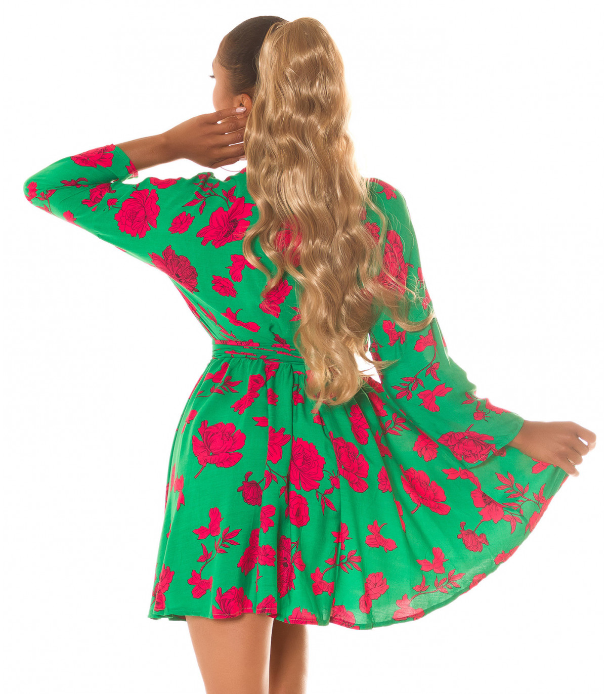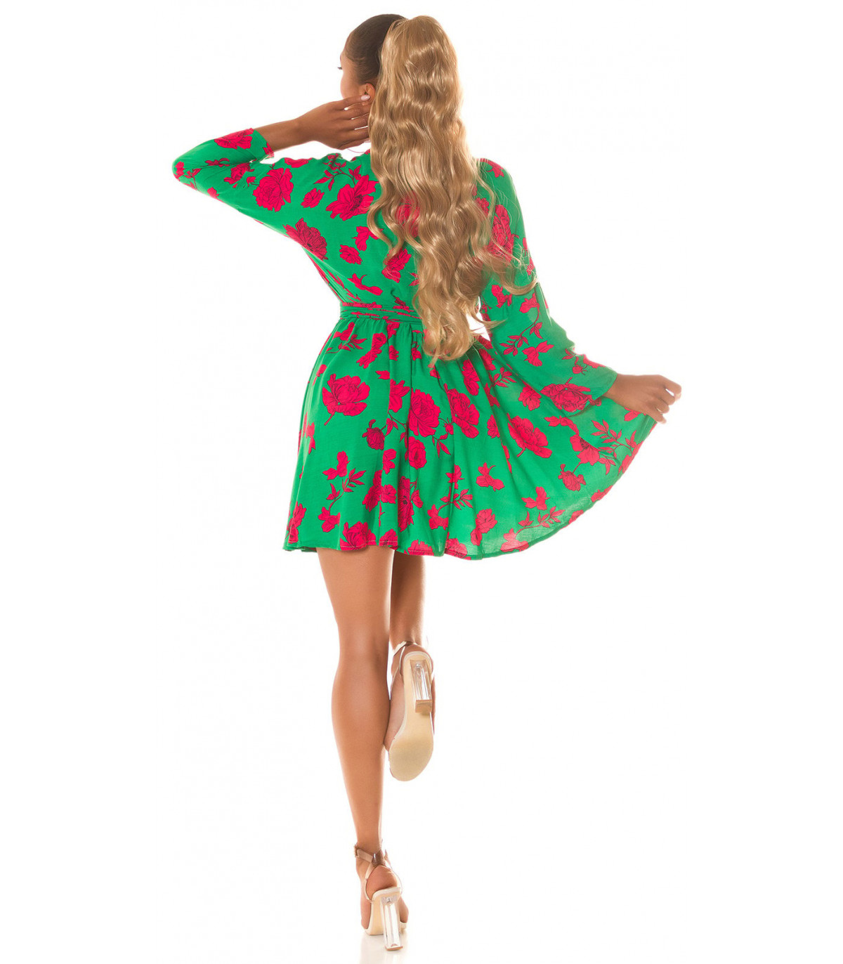 Vihreäpunainen pitkähihainen ruusukuvioinen wrap-look v-mekko vyöllä.