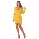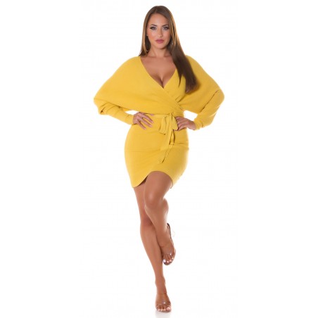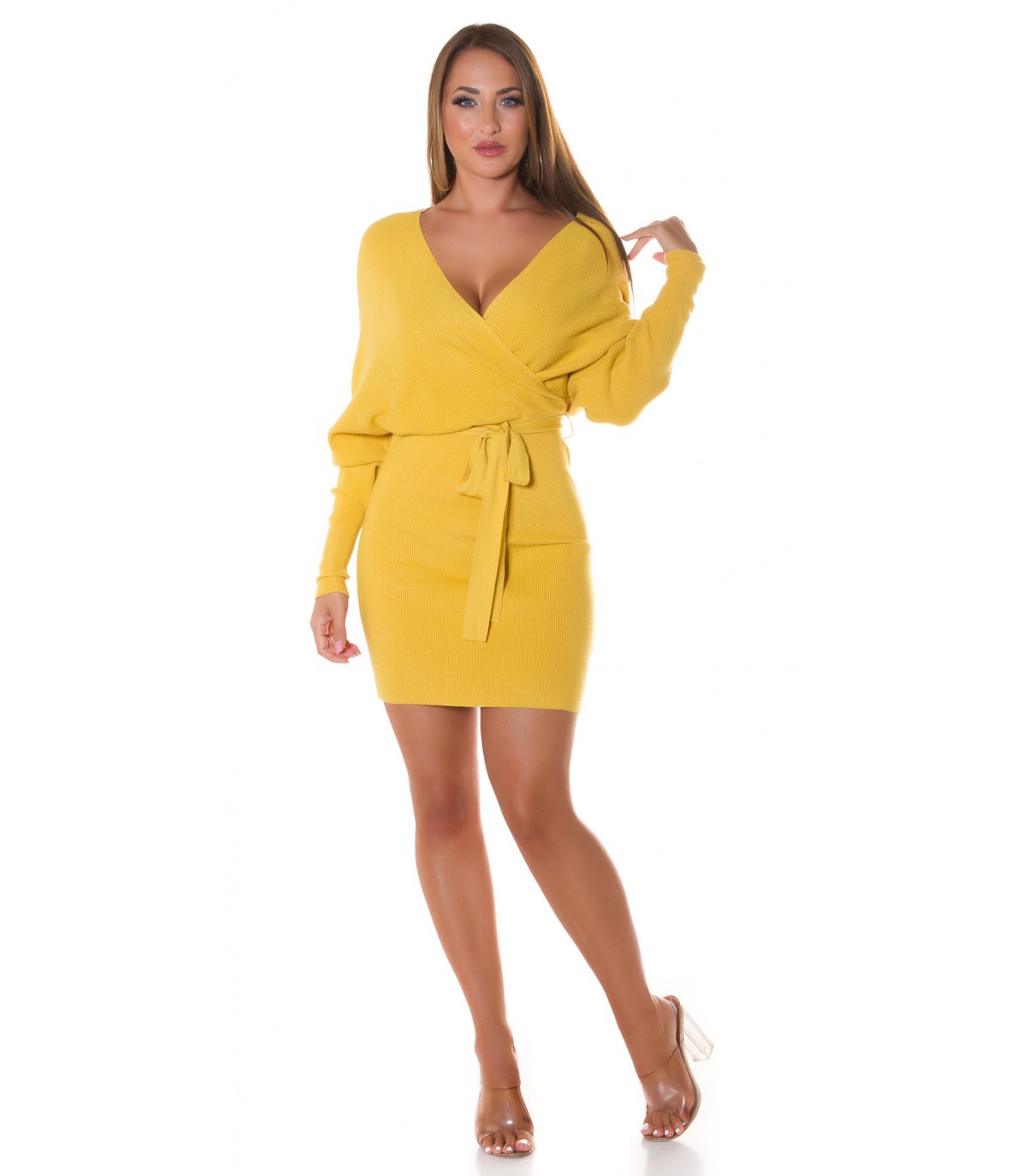 Keltainen wrap-look v-neulemekko lepakkohihoilla ja vyöllä