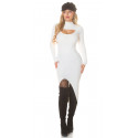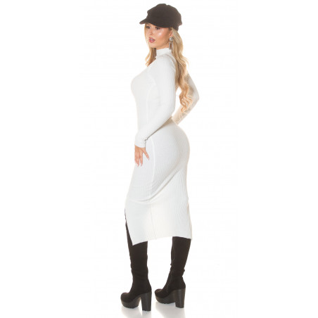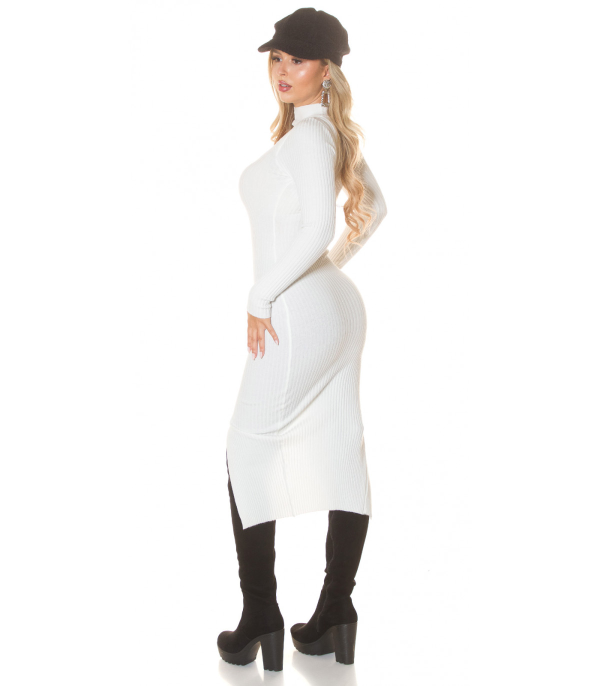Upea valkoinen ribbineulemekko kurkistusaukolla ja halkiolla - seksikäs neulemekko itsevarmoille naisille