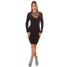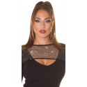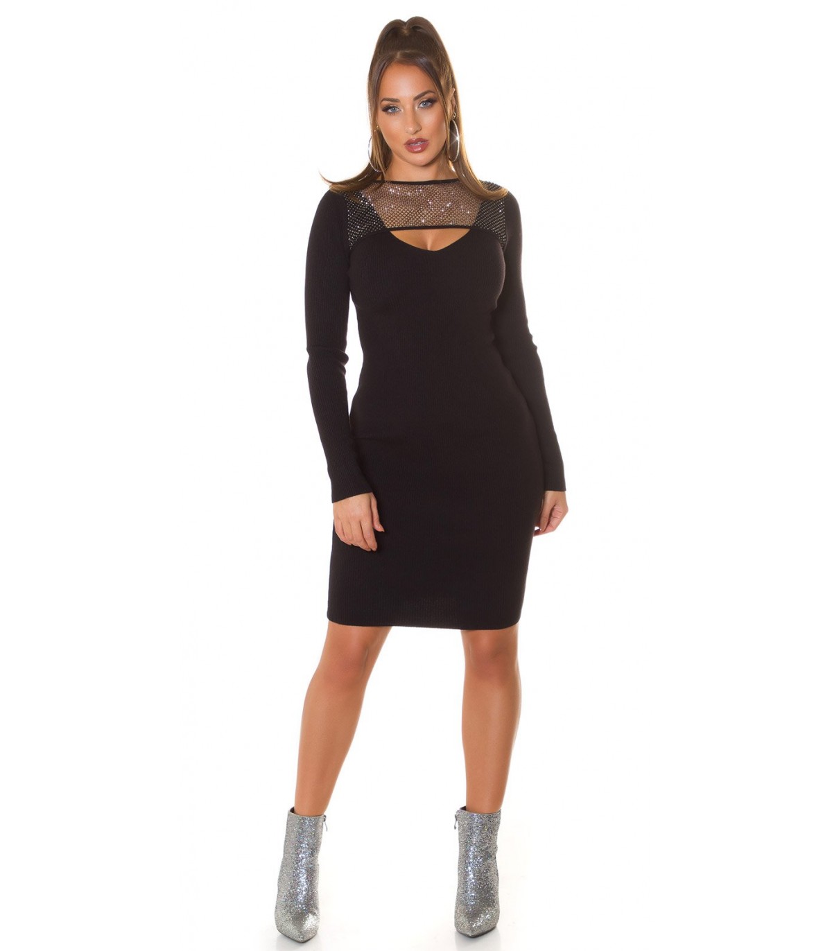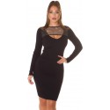 Musta pitkähihainen ribbineulemekko kurkistusaukolla ja strassiverkolla.