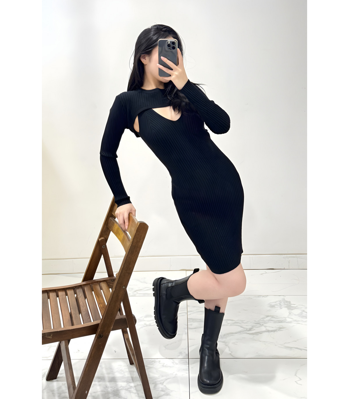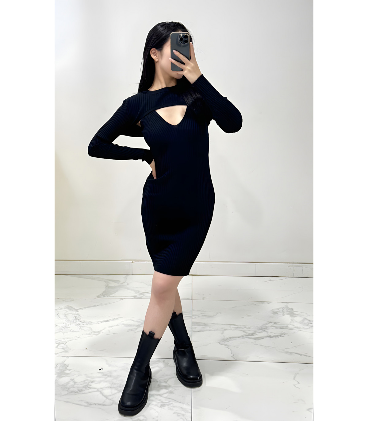 Ihanan joustava neulemateriaali yhdistettynä kurkistusaukkoon tekevät tästä vaateyhdistelmästä sekä erittäin seksikkään että mukavan päällä. Musta mekko on riittävän yksinkertainen myös arkikäyttöön, mutta näyttävien yksityiskohtiensa vuoksi se sopii loistavasti myös treffeille ja illanistujaisiin. Kaksiosainen setti mahdollistaa erilaisia tyylejä, sillä voit yhdistää kaksiolkaimisen mekon myös neuletakin/jakun kanssa tai käyttää sitä sellaisenaan. Myös lyhyen neuleen voi yhdistää erilaisen topin tai mekon kanssa. Käytä yhdessä tai erikseen!