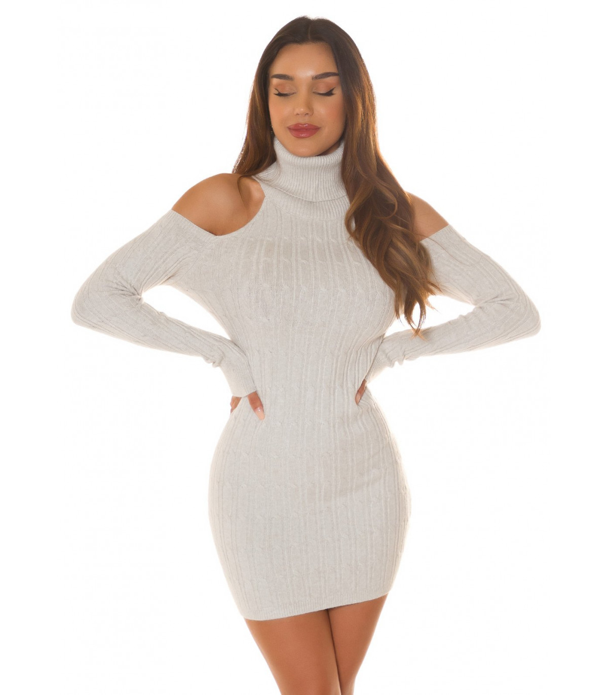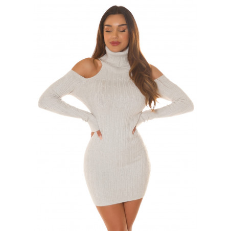 Tyylikäs beige bodycon pooloneulemekko olkahalkiolla - seksikäs basic neulemekko pienillä yksityiskohdilla