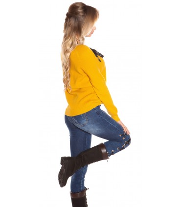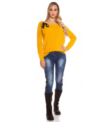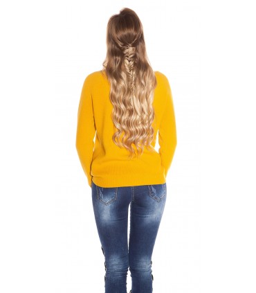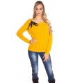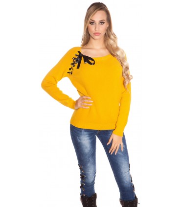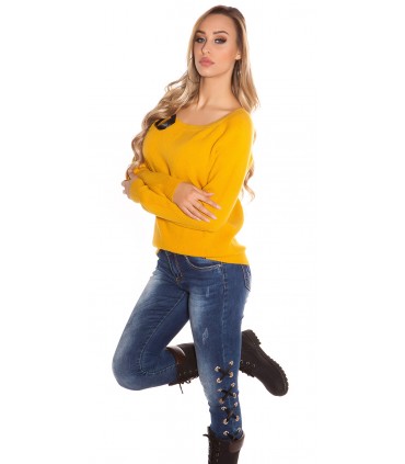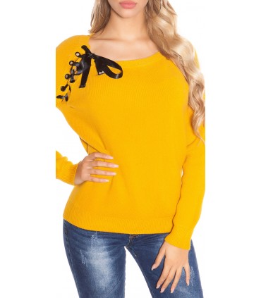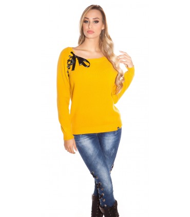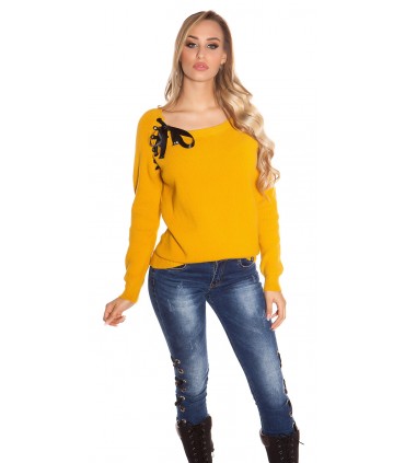 Koucla sinapinkeltainen väljä neule olkanyörityksellä