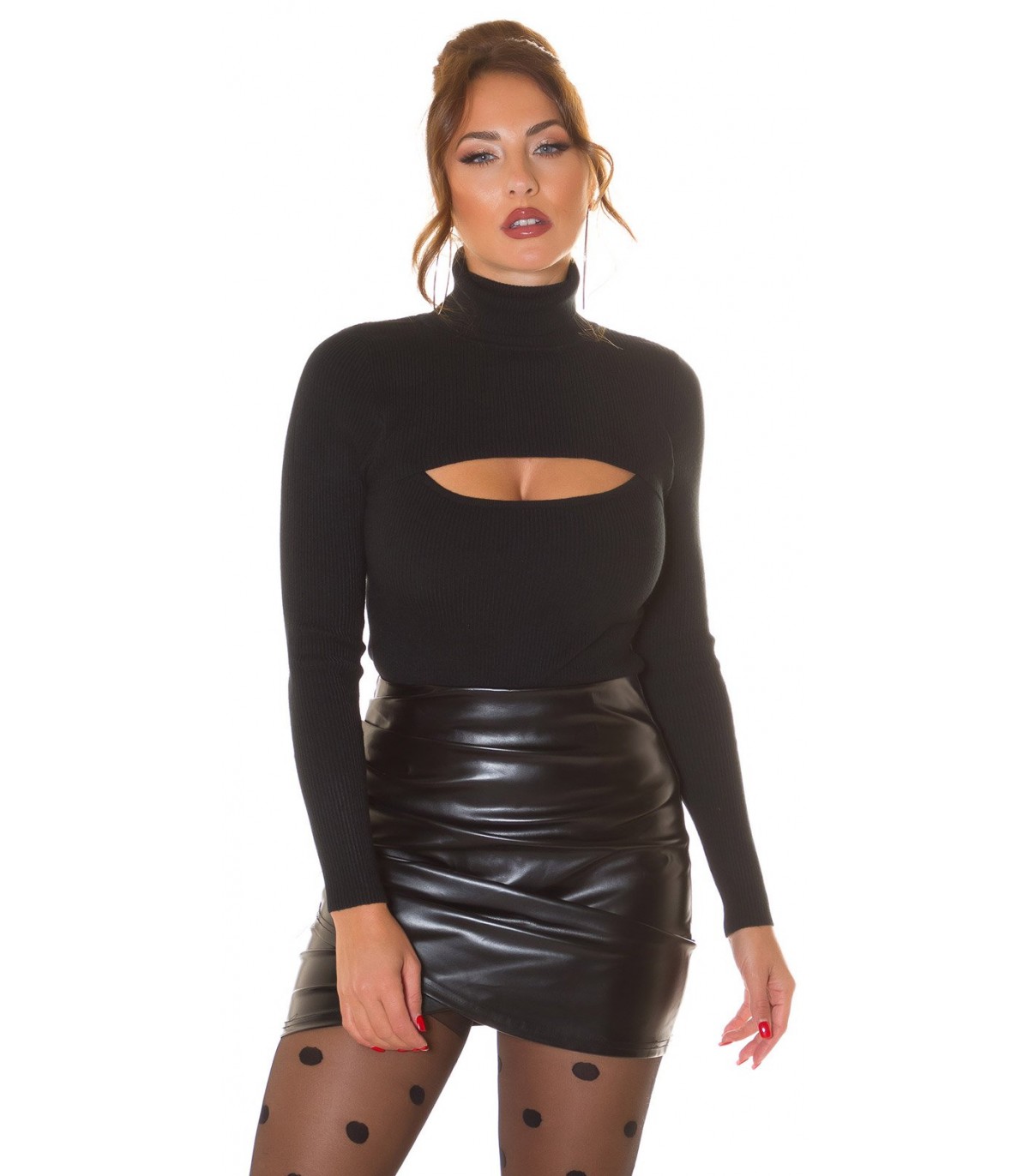 Musta pitkähihainen normaalimittainen korkeakauluksinen ribbineule kurkistusaukolla.