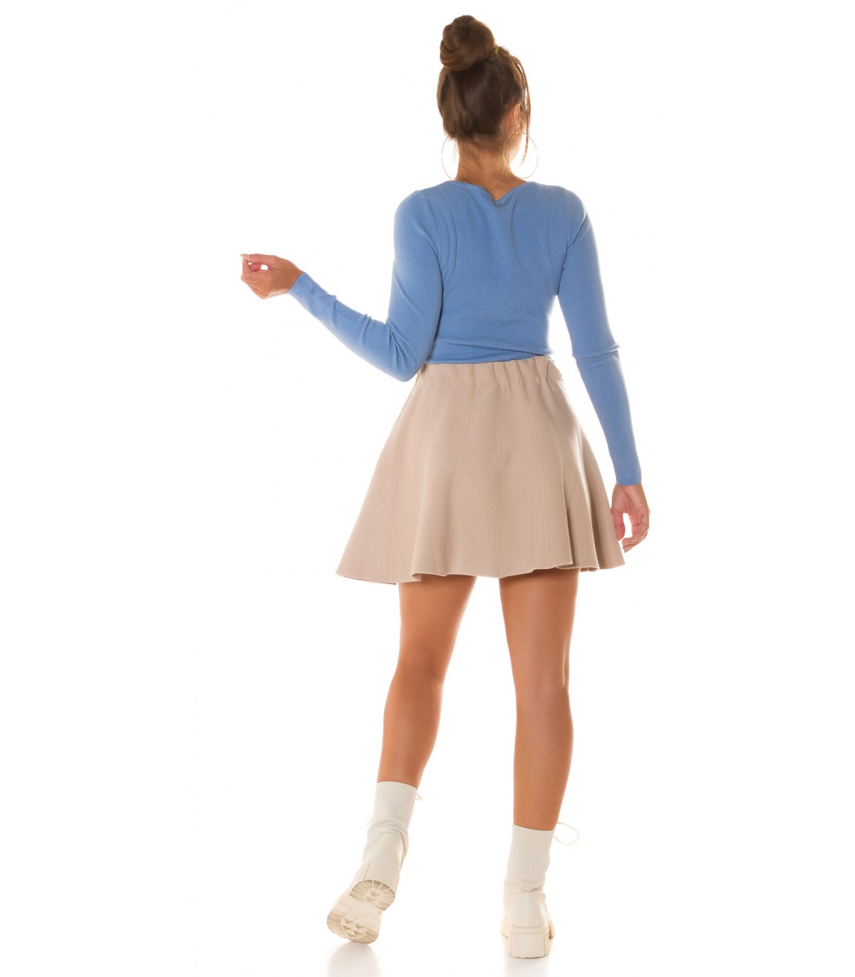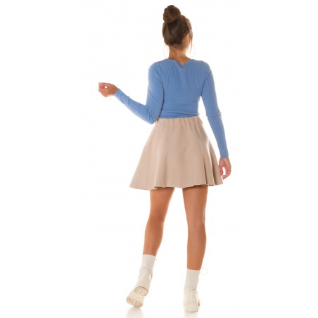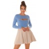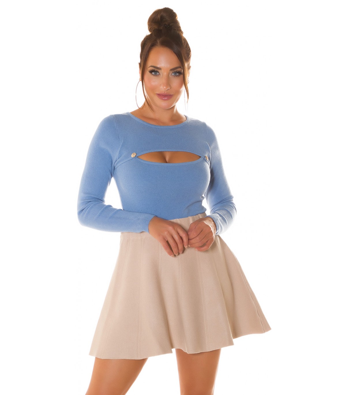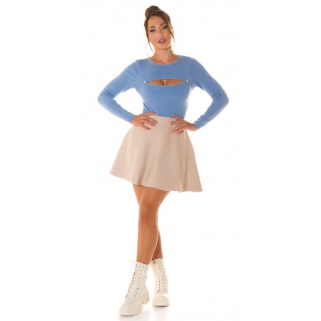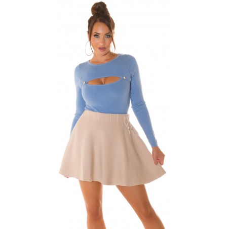 Vaaleansininen nappikoristeinen neule kurkistusaukolla