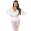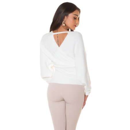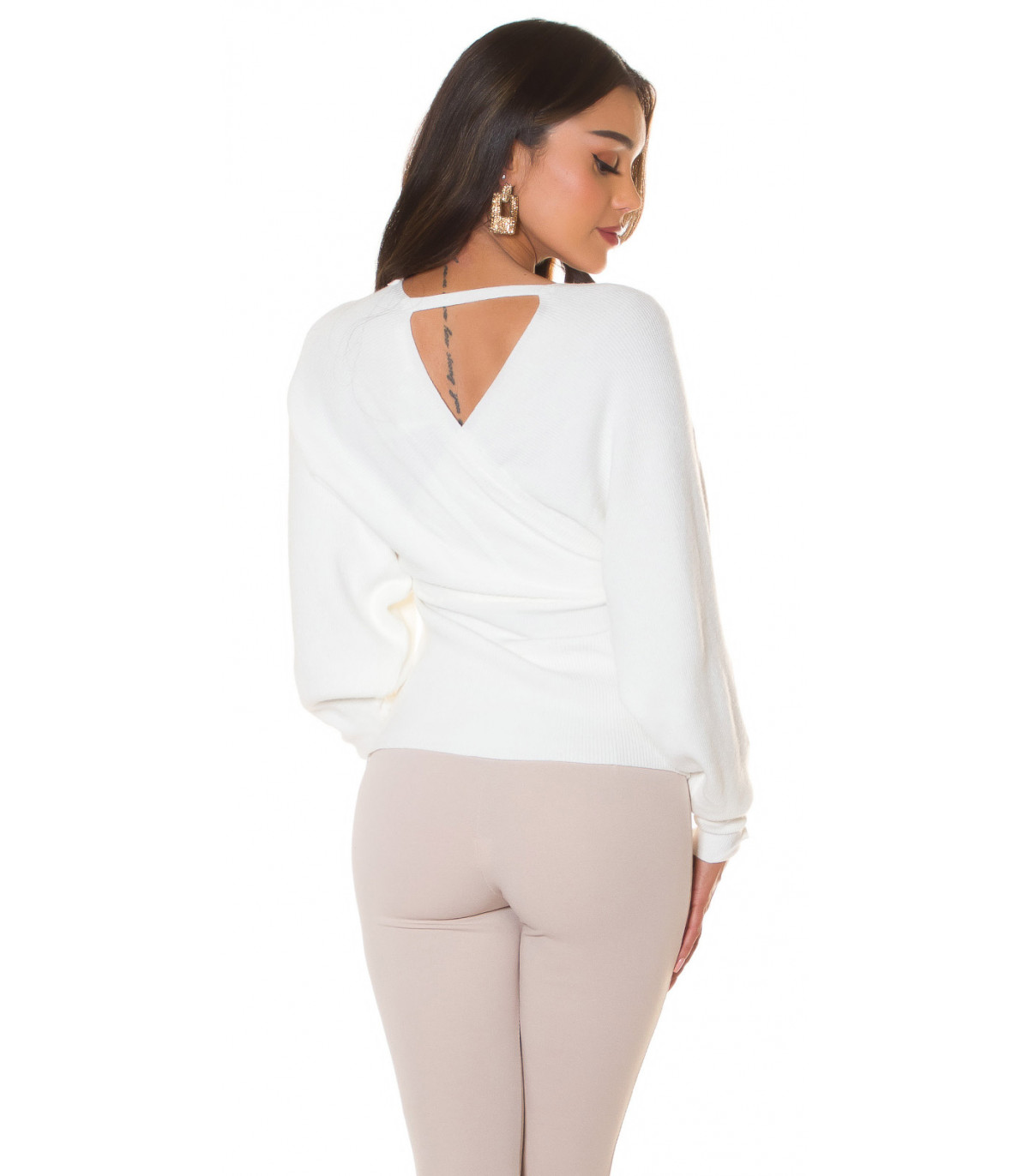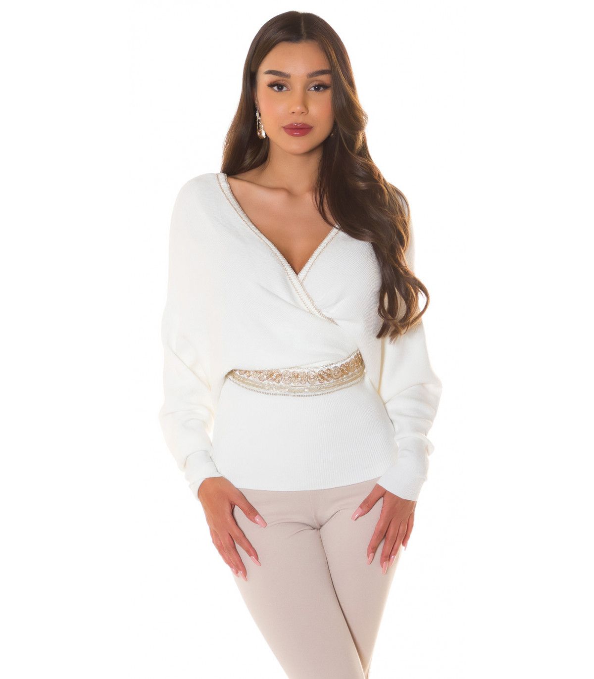 Valkoinen koristeinen lepakkohihainen wrap-look v-neule