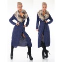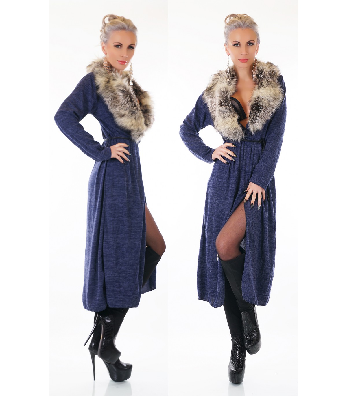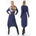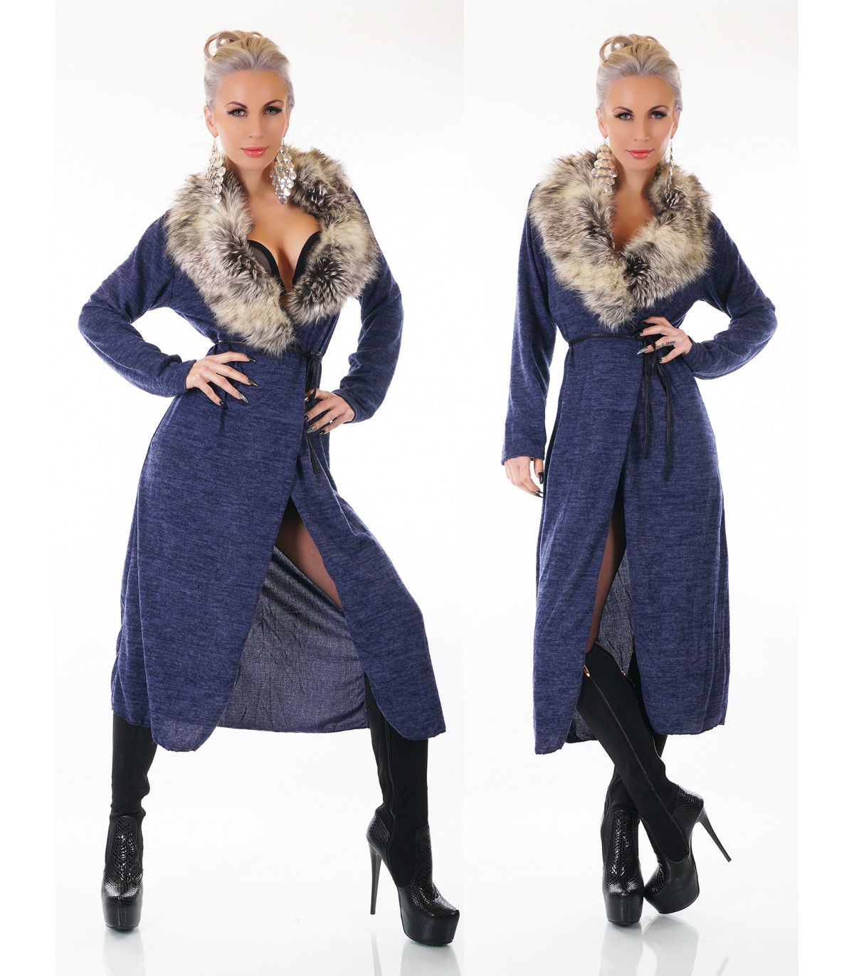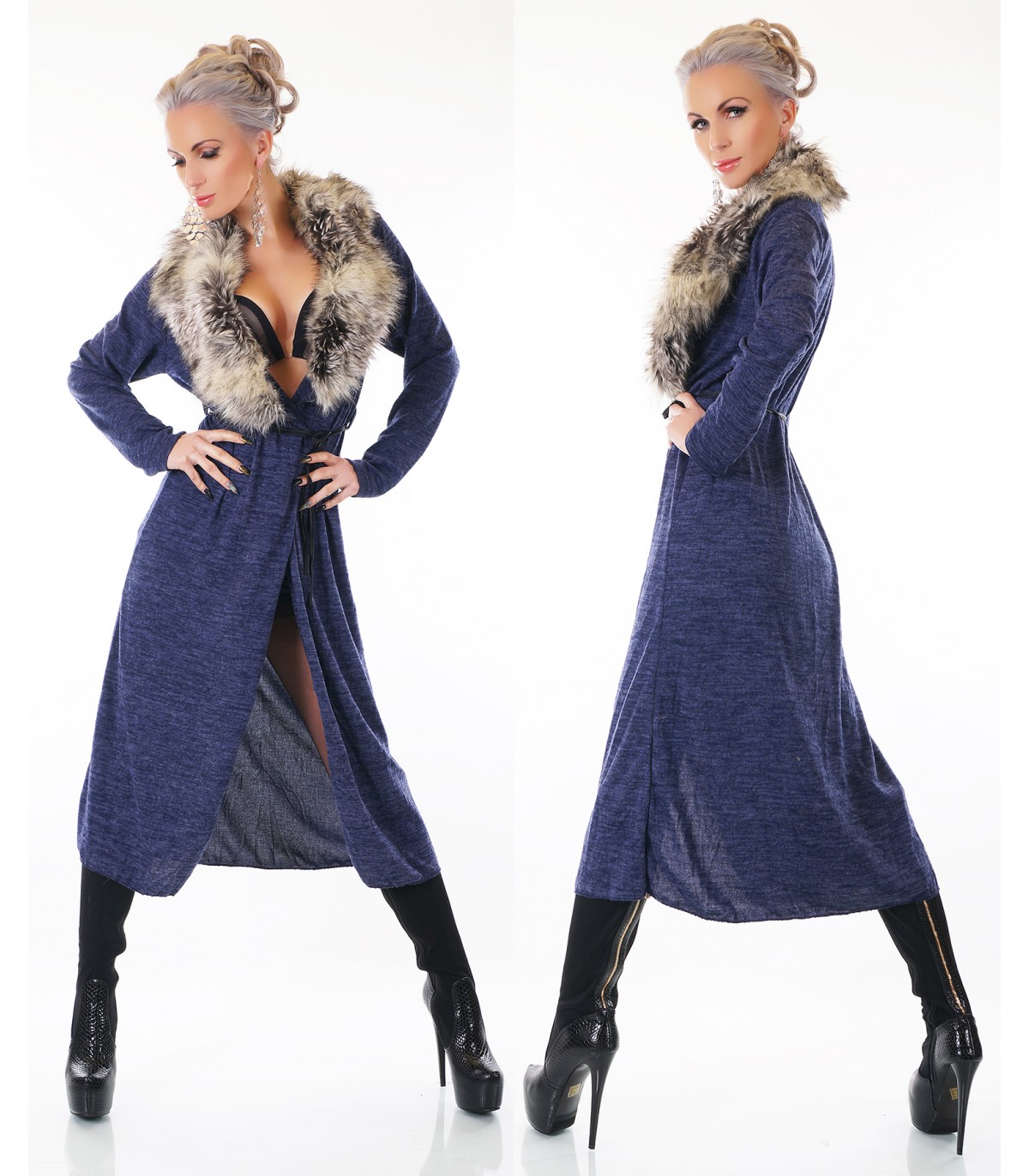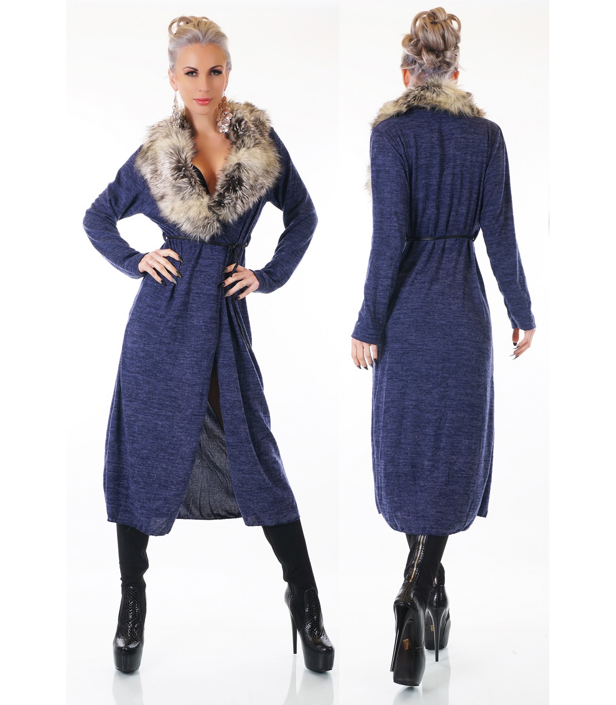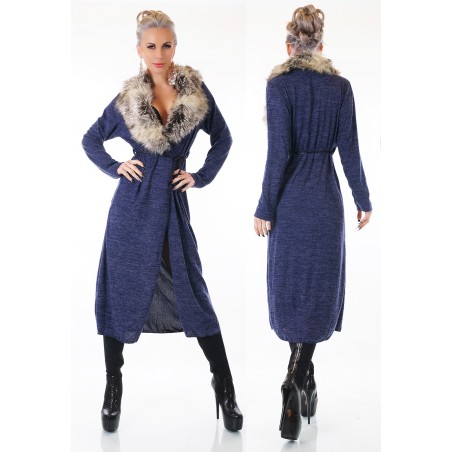 Tummansininen pitkä neuletakki tekoturkiskauluksella