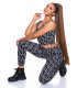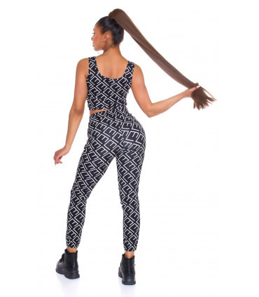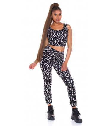 Musta printtikuvioinen lyhyt toppi ja yhteensopivat korkeavyötäröiset joggerit. Joggerit sopivat parhaiten lantioon nähden kapeavyötäröisille ja n. 165-senttisille. Käytä yhdessä tai erikseen!