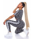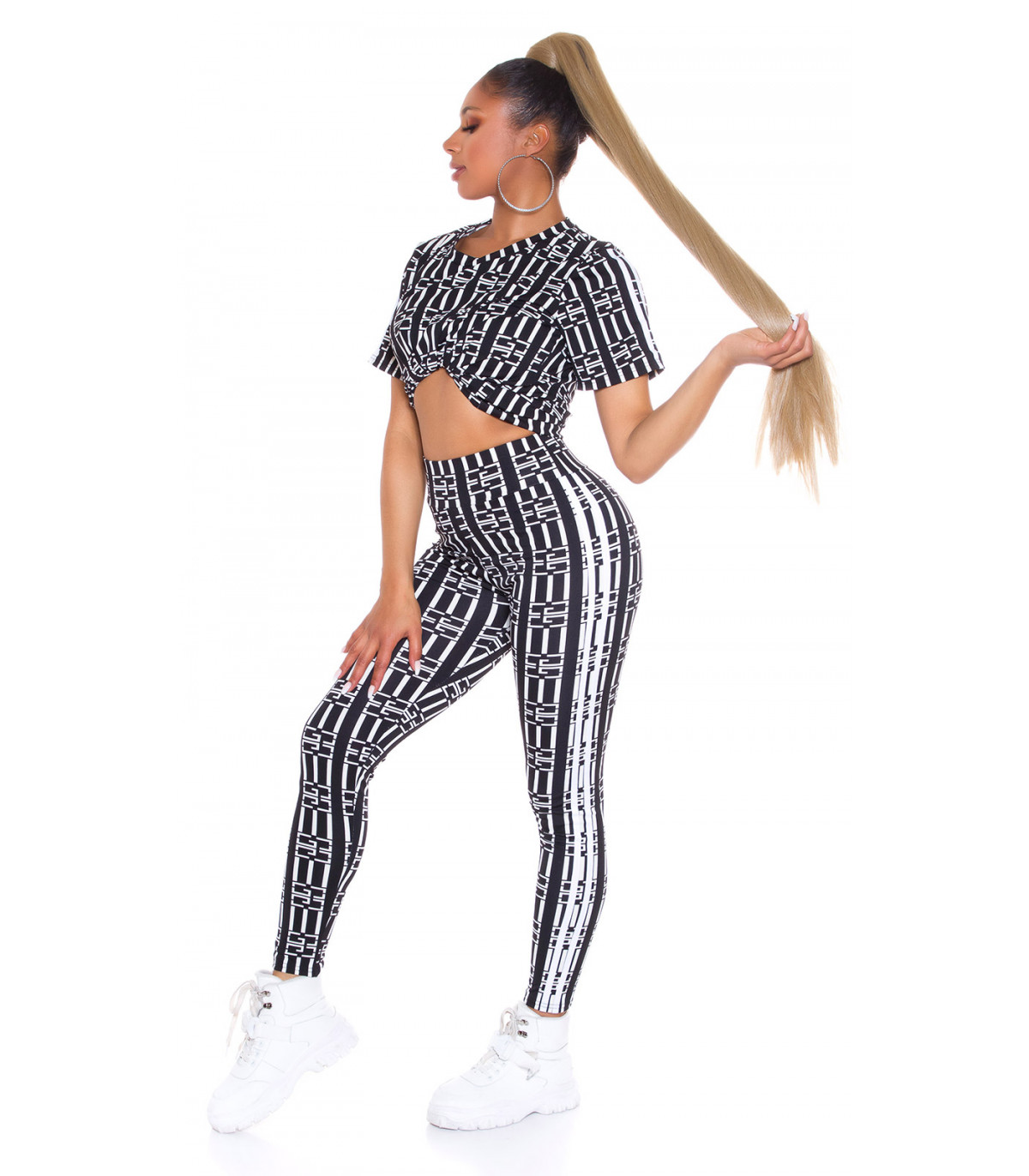 Musta printtikuvioinen lyhythihainen väljä paita raidoilla ja yhteensopivat korkeavyötäröiset trikoot. Trikoot sopivat parhaiten lantioon nähden kapeavyötäröisille ja n. 165-senttisille. Käytä yhdessä tai erikseen!