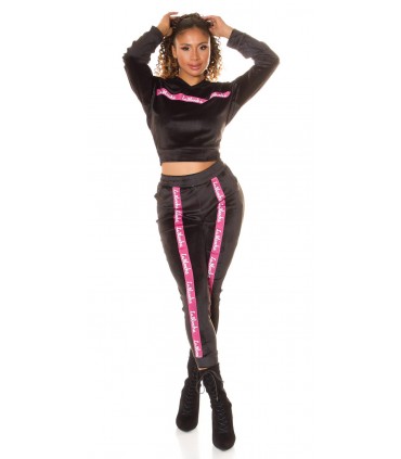 Musta oloasusetti sisältää lyhyen hupullisen paidan ja yhteensopivat korkeavyötäröiset joggerit pinkeillä raidoilla ja valkoisilla La Blanche -teksteillä. Joggerit sopivat parhaiten n. 160-senttisille ja lantioon nähden kapeavyötäröisille.