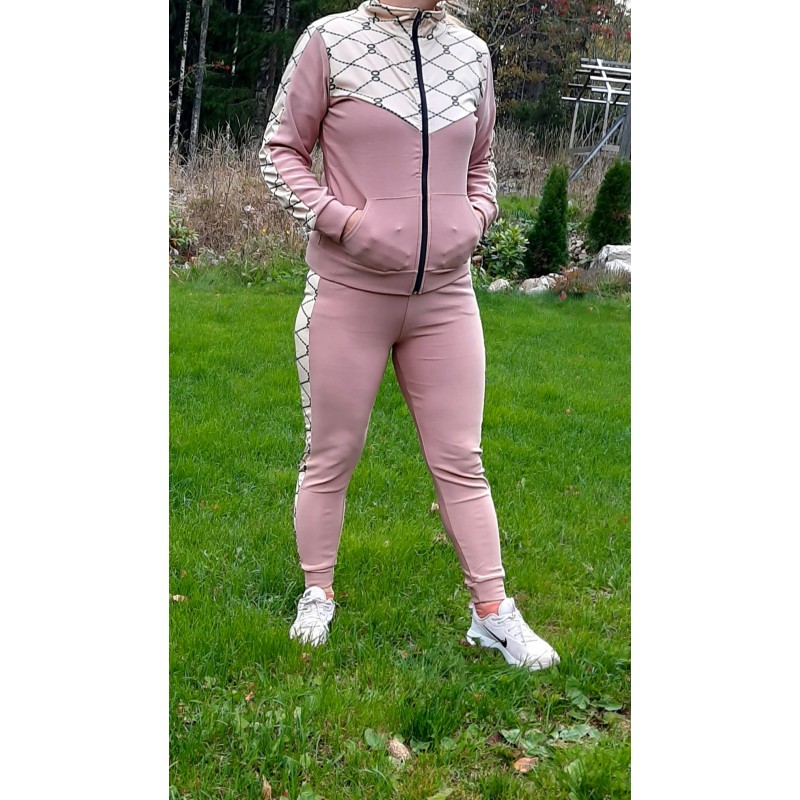 I ordered a size l / xl. Normally I use size m / 38. Flexible material. Not too skinny when I took a bigger size based on previous reviews. Probably s / m would have been pretty tight. Trousers with high waist. The color does not match the product image, in nature the old shade of pink. X pattern on the sleeves, although in the product image it is on the sides of the pants. Really nice looking outfit. I like :)