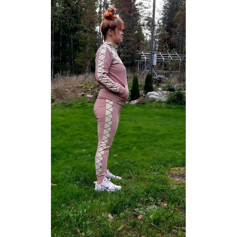 Tilasin koon l/xl. Normaalisti käytän kokoa m/38. Joustavaa materiaalia. Ei liian ihonmyötäinen kun otin isomman koon aikaisemman arvostelun perusteella. Luultavasti s/m olisi ollut aika tiukka. Housut korkeavyötäröiset. Väri ei vastaa tuotekuvaa, luonnossa vanha roosan sävyinen. Hihoissa x kuvionti, vaikka tuotekuvassa se on housujen sivuissa. Tosi kivan näköinen oloasu. Tykkään :)