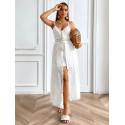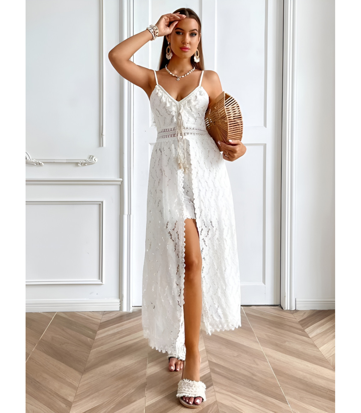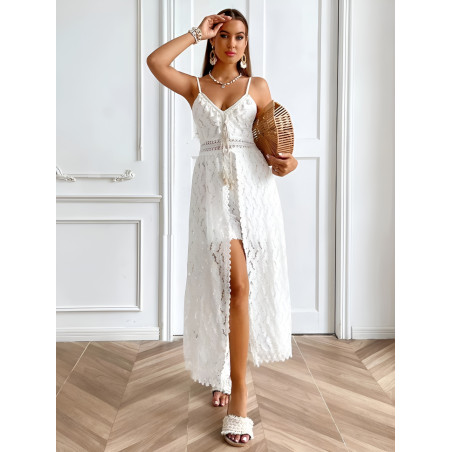 Rosy Days:n upea valkoinen pitsinen playsuit/mekko-yhdistelmä on tyylikäs ja seksikäs valinta itsevarmalle naiselle. Playsuitmekko yhdistää elegantin valkoisen pitsin ja modernin playsuit-mallin, luoden upean ja mukavan asun. Pitkä pitsihelma tuo asuun ylellisyyttä ja naisellista charmia, kun taas haalarimainen alaosa takaa mukavuuden ja liikkumisvapauden ilman pelkoa vilautusvaarasta. Täydellinen valinta erilaisiin juhliin, cocktail-tilaisuuksiin tai romanttisille treffeille.