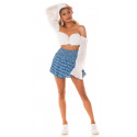 Sininen korkeavyötäröinen printtikuvioinen shortsihame. Hame sopii parhaiten lantioon nähden kapeavyötäröisille. Lantionympärys vastaa normaalia mitoitusta, vyötärönympärys on pienempää mitoitusta.