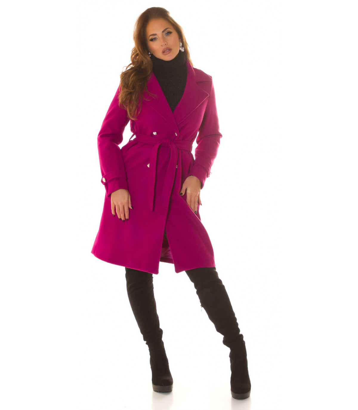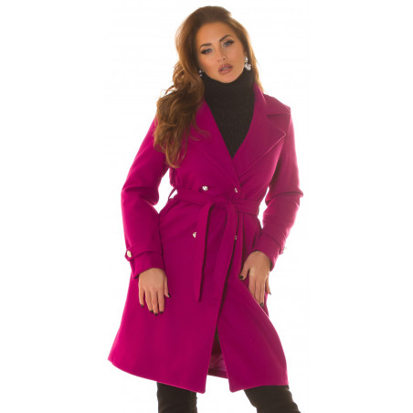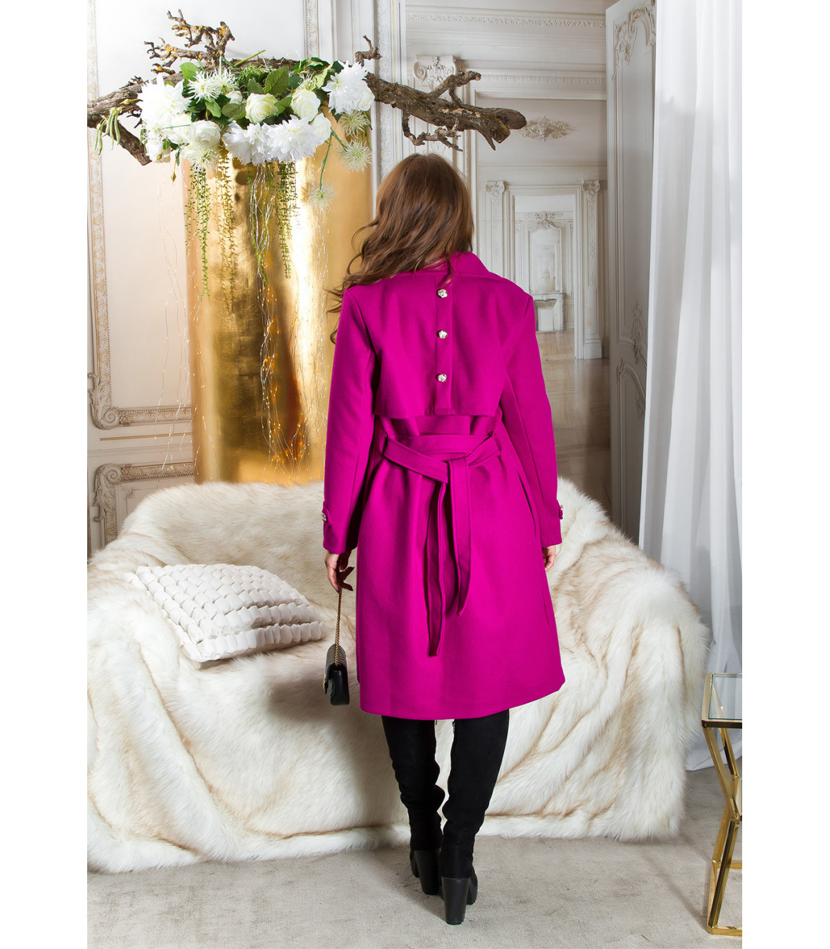Elegantti tumman pinkki pitkä trenssitakki vyöllä ja koristeilla - kevyt ajaton takki syksyyn ja kevääseen