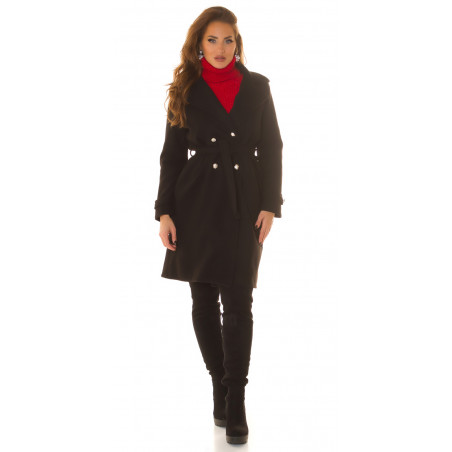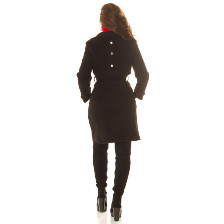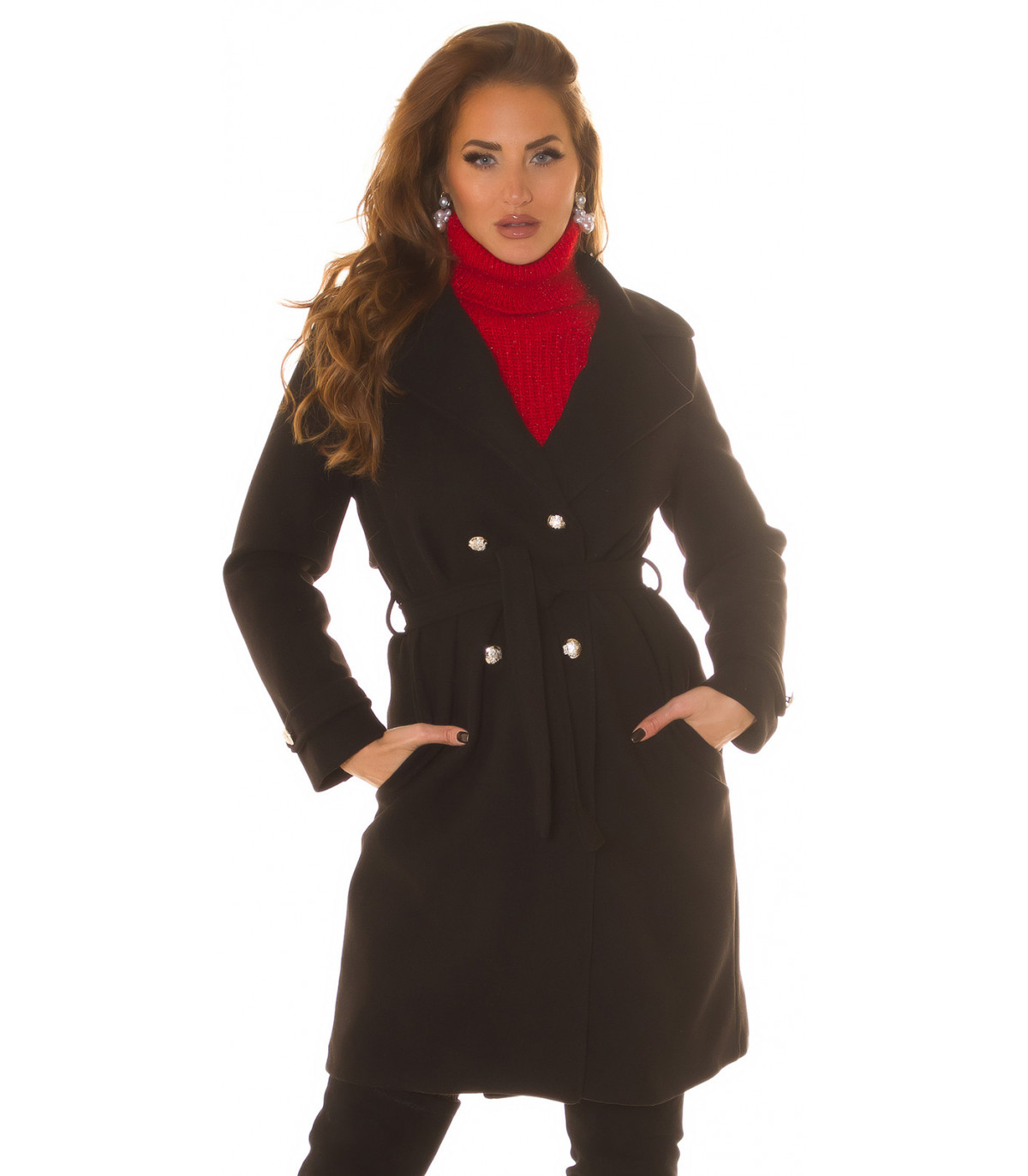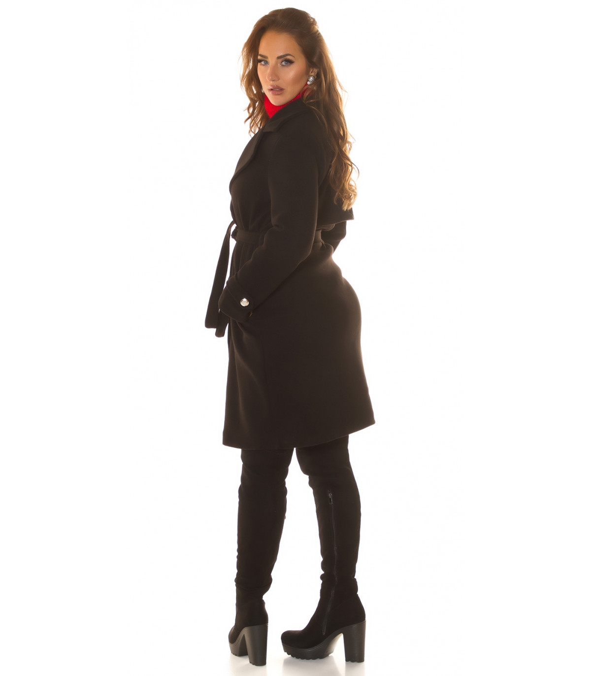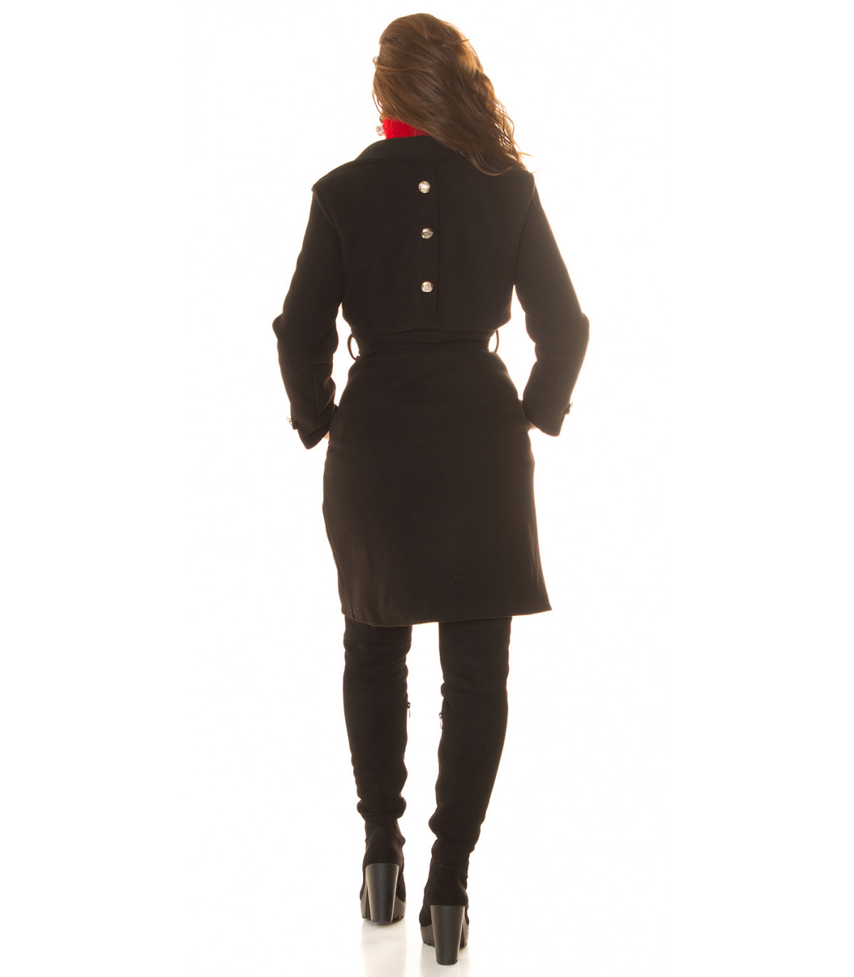 Elegantti musta pitkä trenssitakki vyöllä ja koristeilla - kevyt ajaton takki syksyyn ja kevääseen