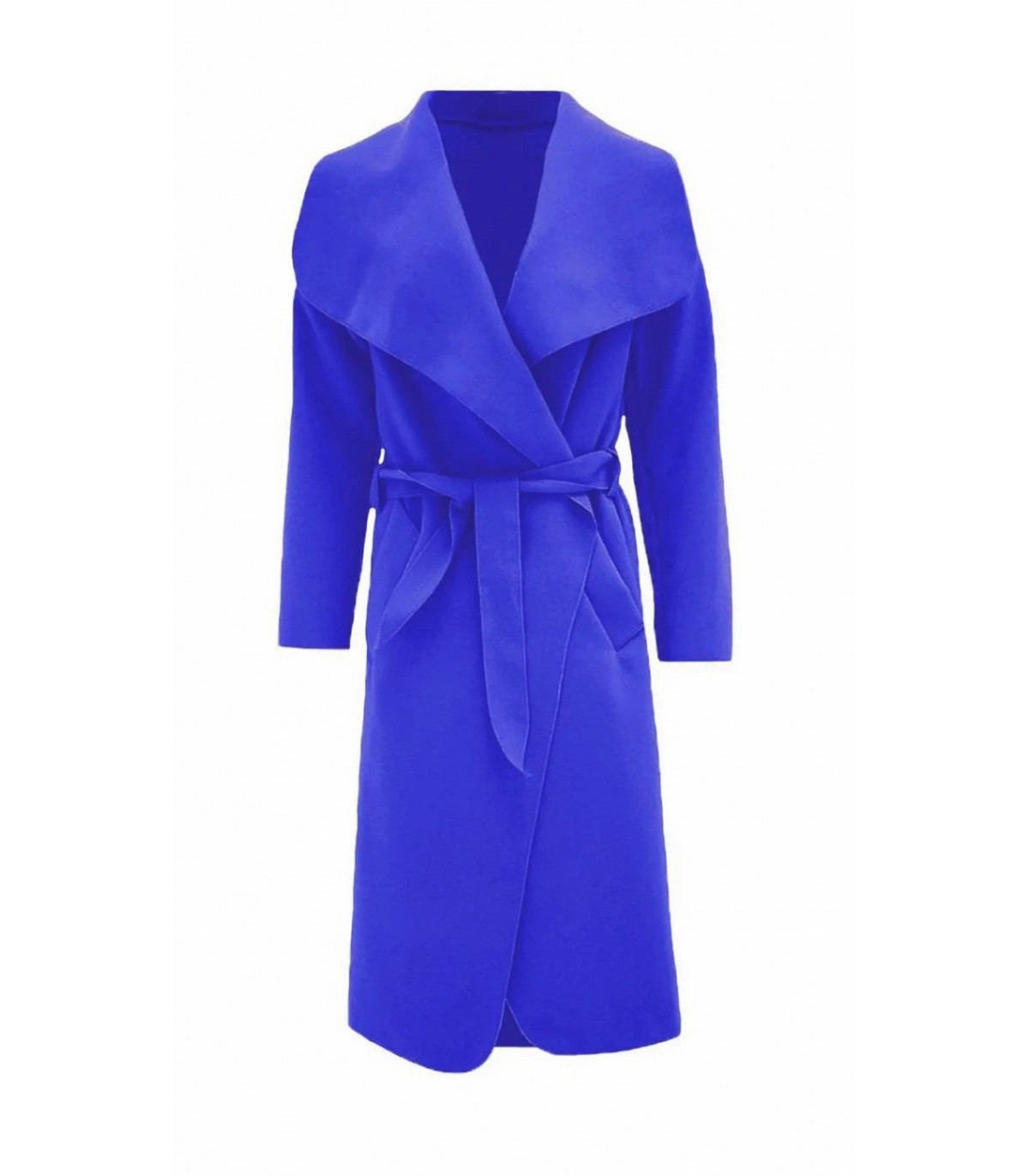 Tyylikäs sininen pitkä trenssitakki vyöllä - kevyt ajaton takki syksyyn ja kevääseen