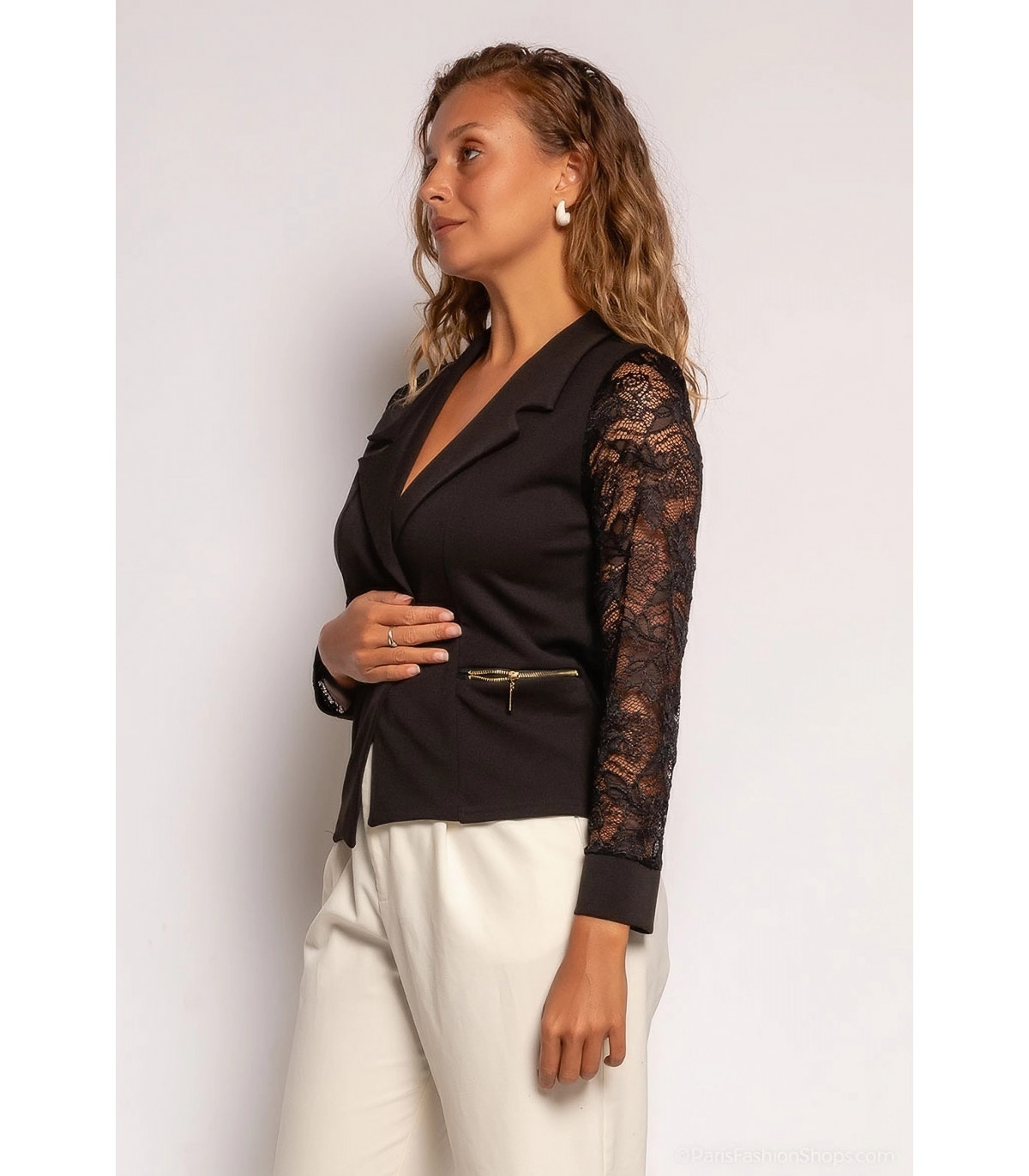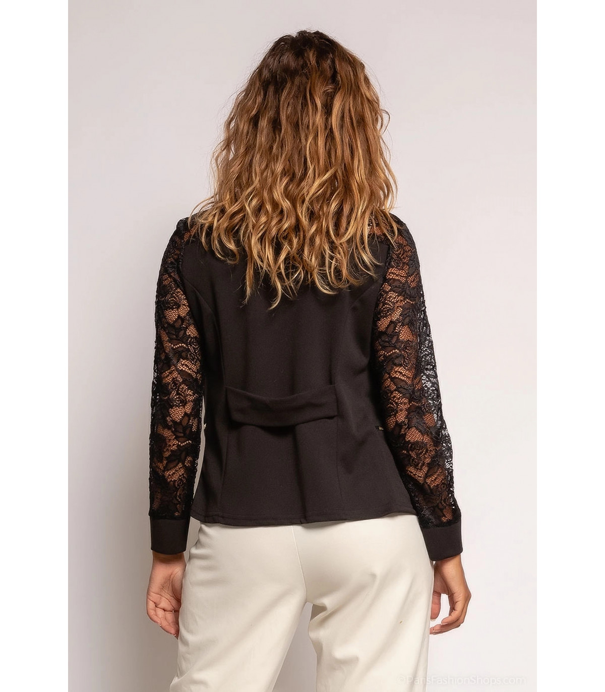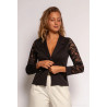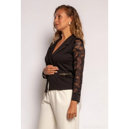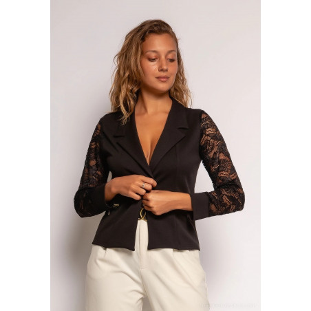 Tyylikäs musta bleiseri pitsihihoilla yhdistää mukavuuden ja hienostuneen tyylin. Tämä Ranskassa valmistettu ajaton bleiseri tuo asukokonaisuuteesi ripauksen pariisilaista eleganssia ja naisellisuutta. Näyttävät yksityiskohdat antavat tyylikkääseen vaatteeseen persoonallisen vivahteen.