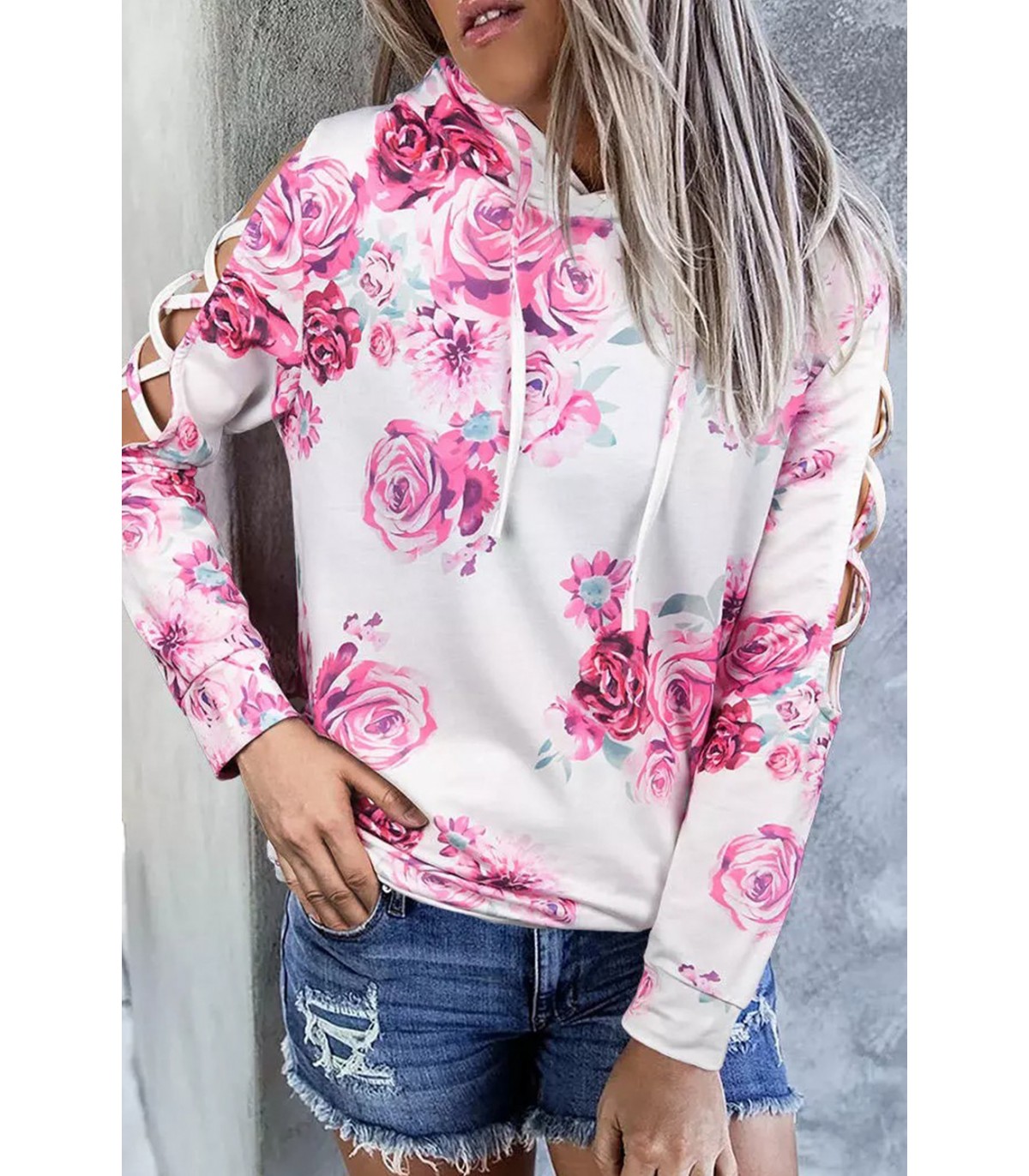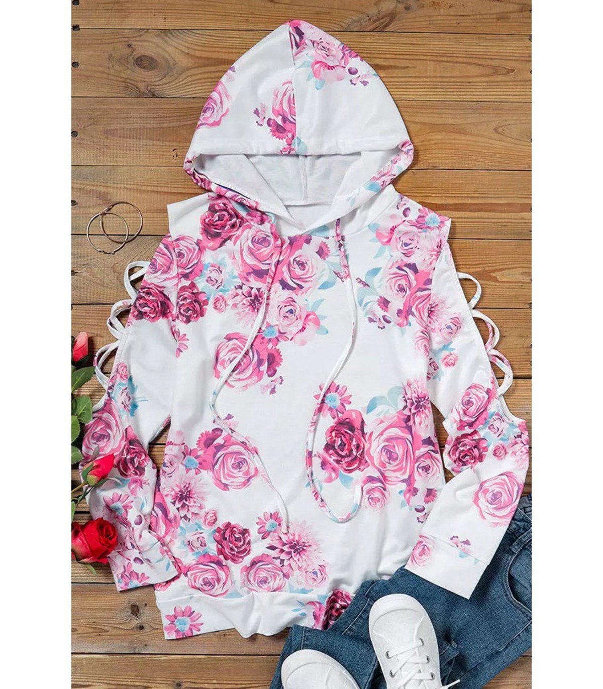 Valkoinen ruusukuvioinen väljä huppari ristikkokoristeisilla hihoilla.