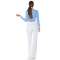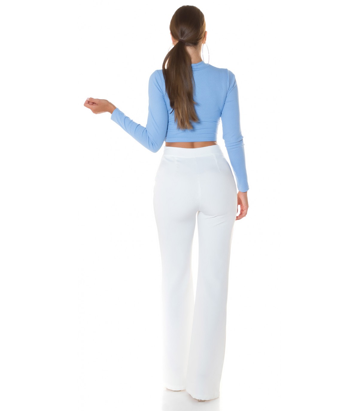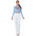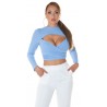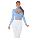 Vaaleansininen pitkähihainen lyhyt wrap-look v-ribbipaita kurkistusaukolla. Paidassa on pehmeät kuppiosat.