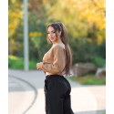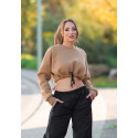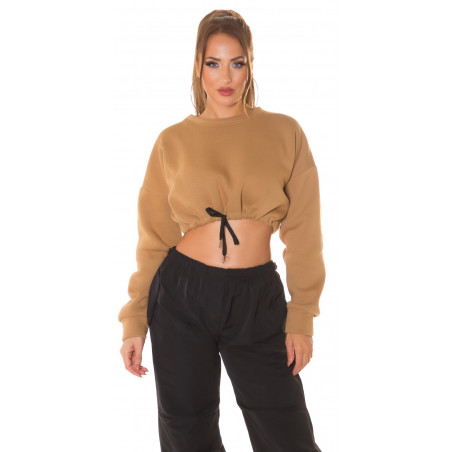 Cappuccino pitkähihainen lyhyt collegepaita kiristettävillä nauhoilla. Hupparimainen collegepaita ilman huppua on erinomainen vaihtoehto hupulliselle hupparille, kun haussasi on rento hupparityylinen yläosa, mutta et tarvitse välttämättä huppua. Huputon "huppari" mahdollistaa rennon lookin, mutta huppu ei ole tiellä. Huputtoman paidan kanssa pitkät hiukset näyttävät upeilta myös auki - ilman hupusta aiheutuvaa kohoumaa niskassa/hiuksissa.