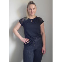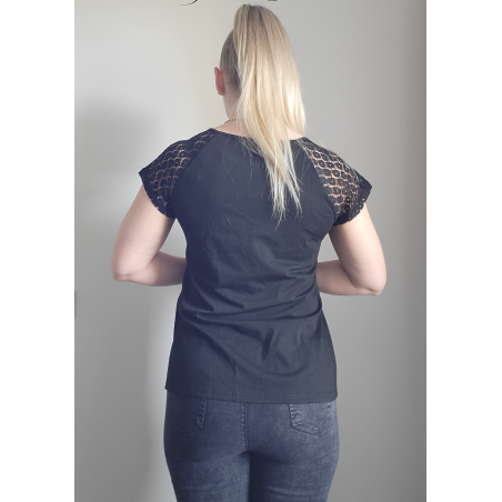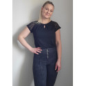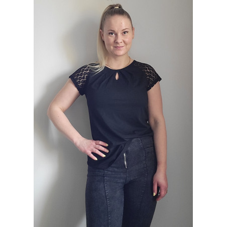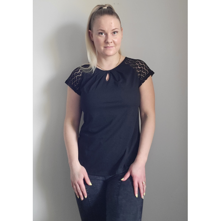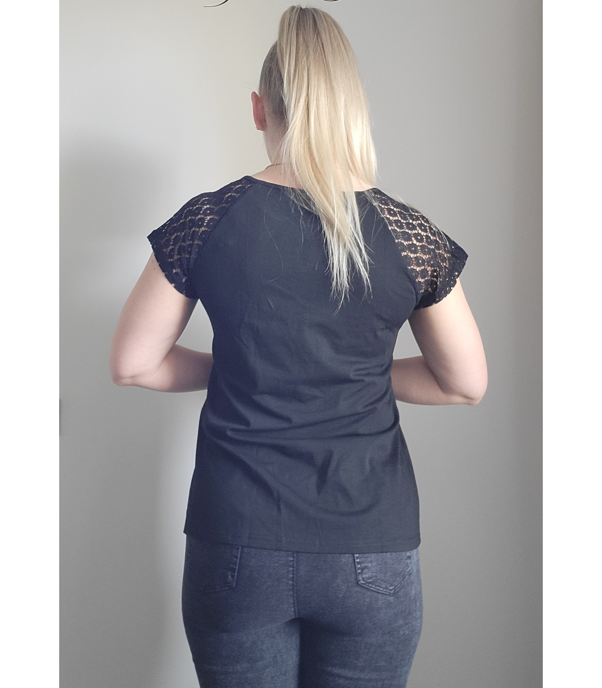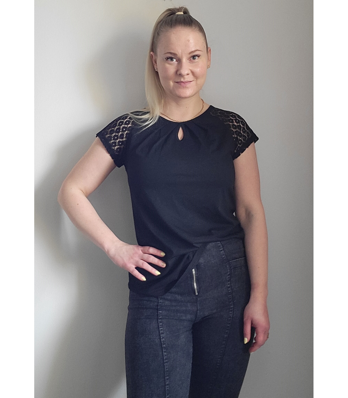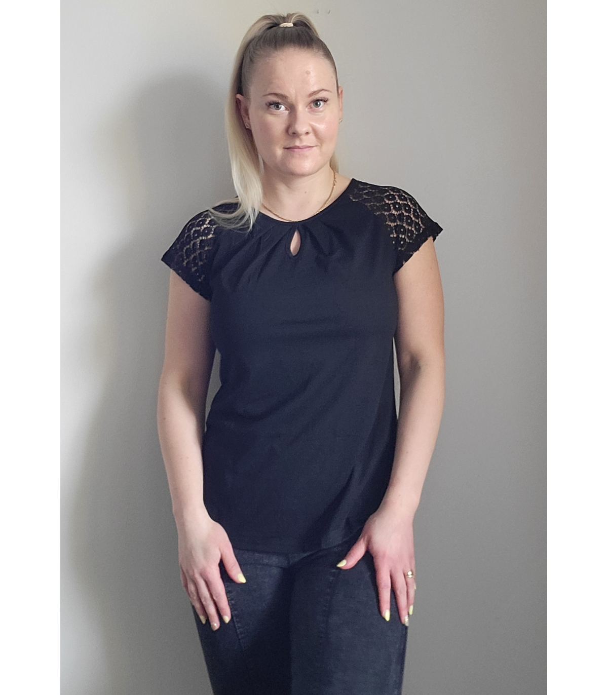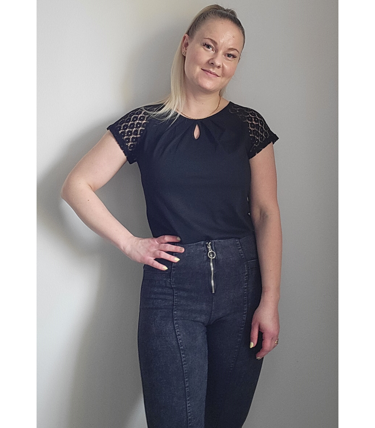 Musta lyhythihainen t-paita pitsihihoilla ja pienellä keyhole kurkistusaukolla. Tämä musta paita on hyvä esimerkki siitä, että myös yksivärinen paita voi olla hieno. Kauniit pitsihihat ja rinnuksessa oleva pieni kurkistusaukko ovat upeita yksityiskohtia, jotka keräävät kehuja. Tyylikäs paita sopii monenlaisiin tilanteisiin, ja se on helppo stailata osaksi erilaisia asukokonaisuuksia. Pitsihihainen paita näyttää hyvältä sekä farkkujen, suorien housujen että hameiden kanssa. Lisäämällä asuun esimerkiksi neuletakin tai jakun, saat lyhythihaisen helposti käyttöön ympäri vuoden.