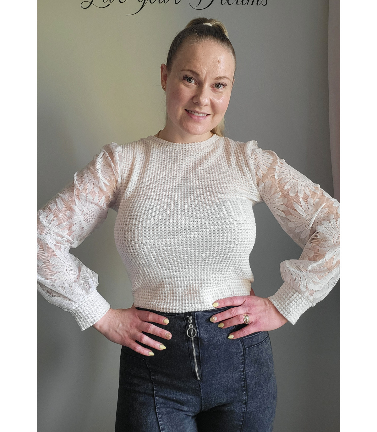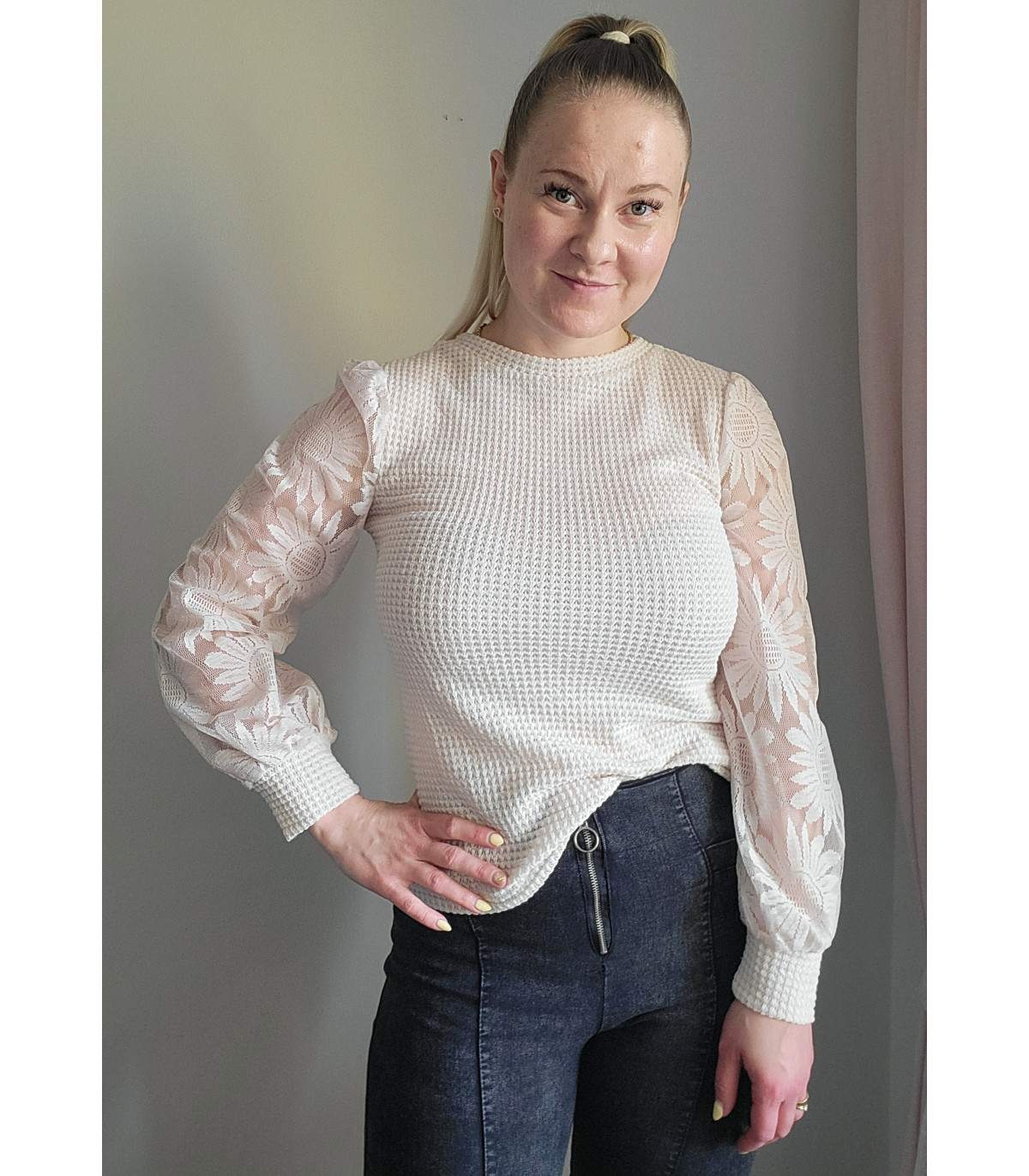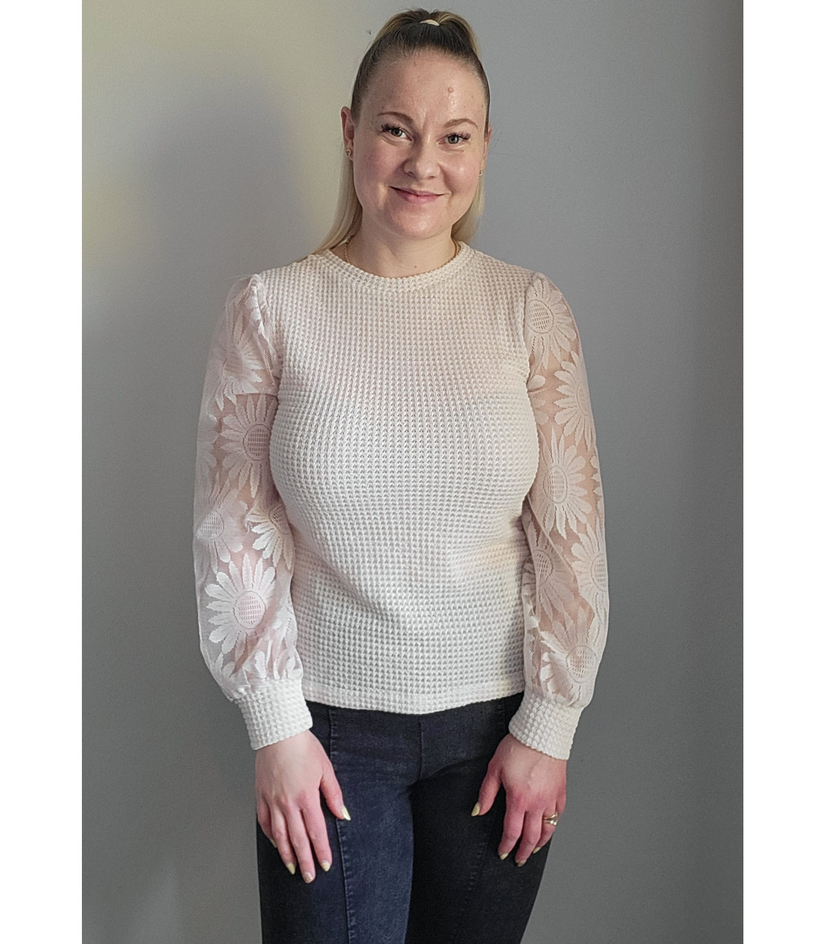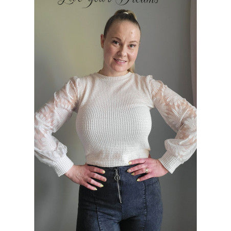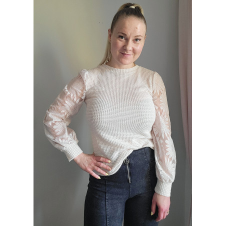 Beige vohvelipaita auringonkukallisilla mesh-pussihihoilla