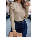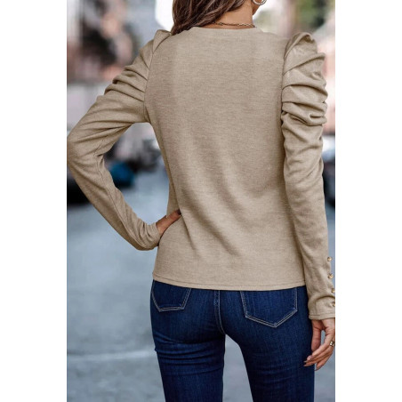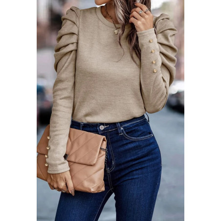 Khaki pitkähihainen väljä paita puhvihihoilla ja helminappikoristeilla. Kaunis puhvihihainen paita ihanilla helminapeilla on täydellinen arkipaita. Pienet mutta näyttävät yksityiskohdat tekevät tästä yksinkertaisesta paidasta upean. Naisten pitkähihainen t-paita sopii loistavasti arkeen, mutta oikein asustettuna hieno paita sopii myös siistimpää pukeutumista vaativiin tilaisuuksiin.