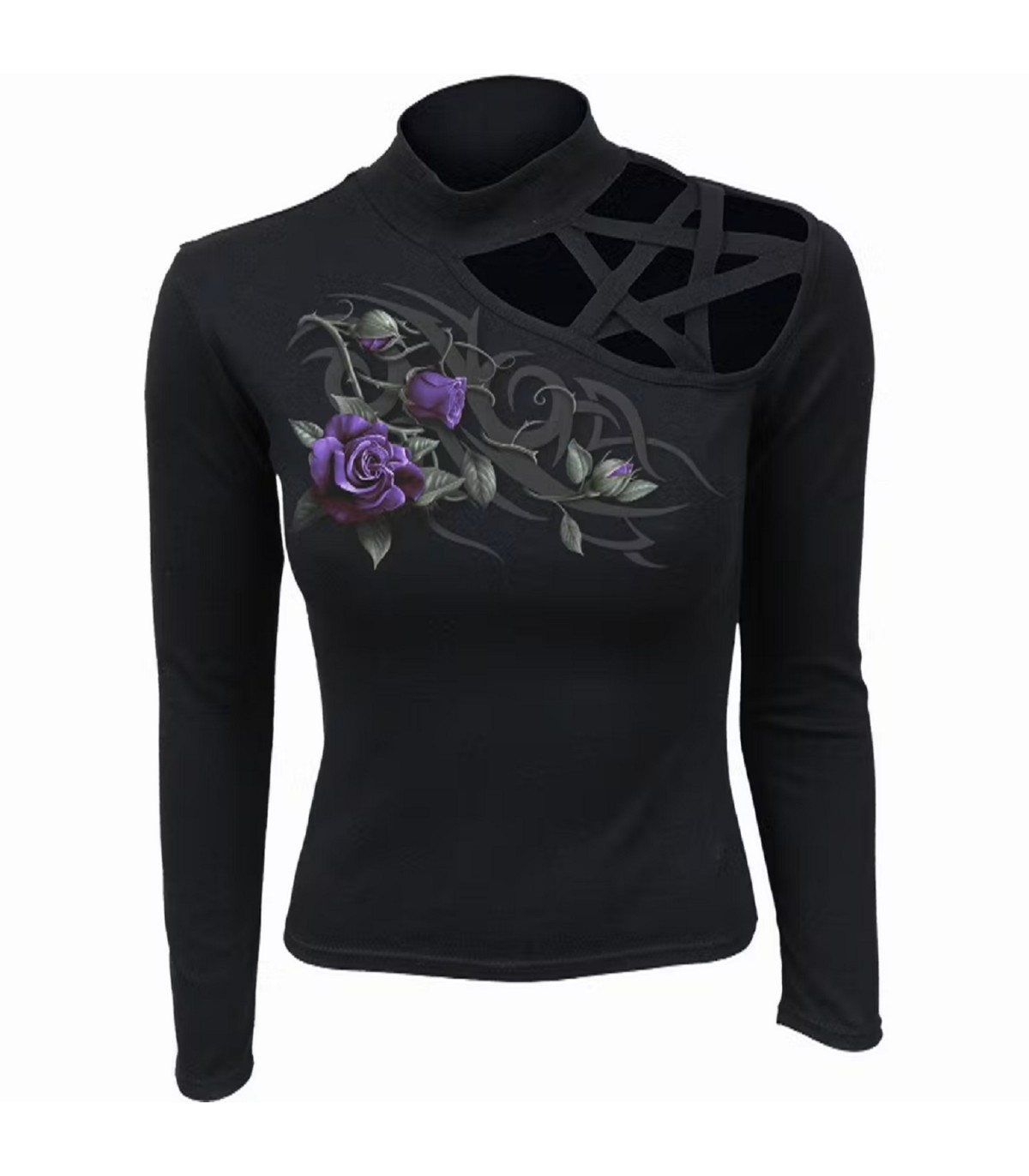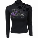 Musta pitkähihainen ruusukuvioinen paita pentagrammiristikolla.