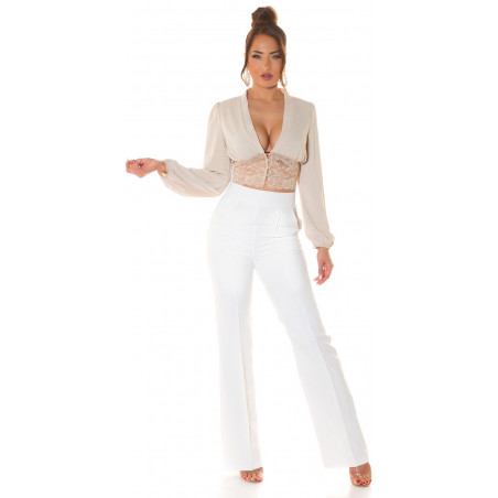 Koucla beige pussihihainen lyhyt v-pusero pitsillä ja helminapeilla