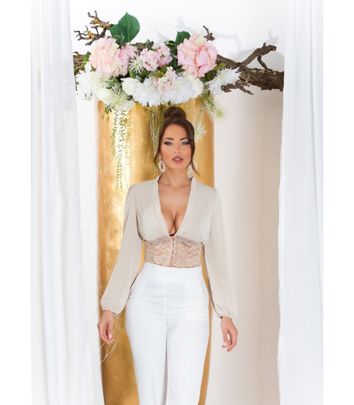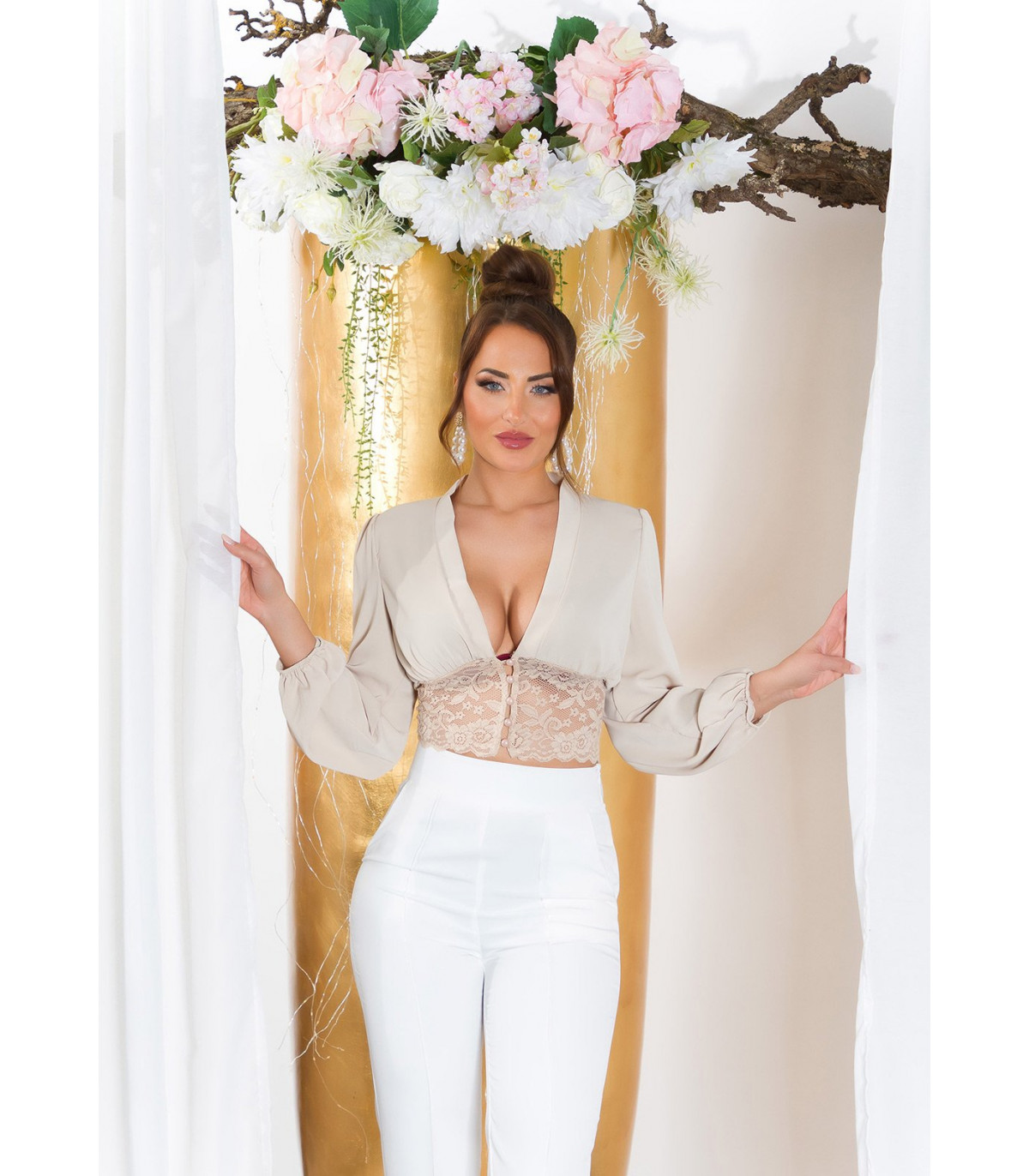 Plus de details Heti varastossa!Koucla beige pussihihainen lyhyt v-pusero pitsillä ja helminapeilla