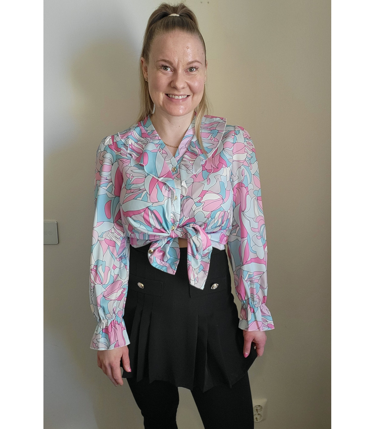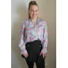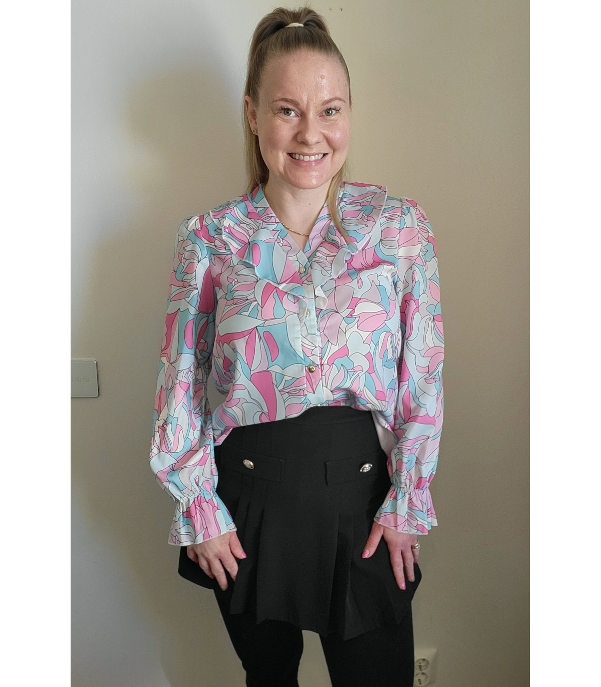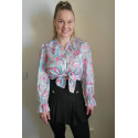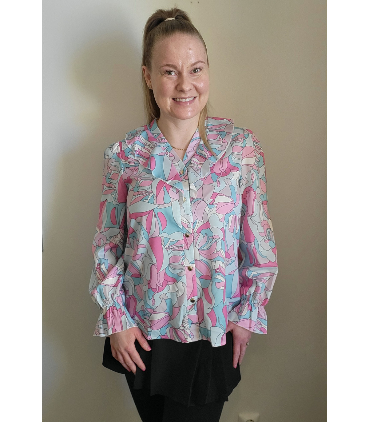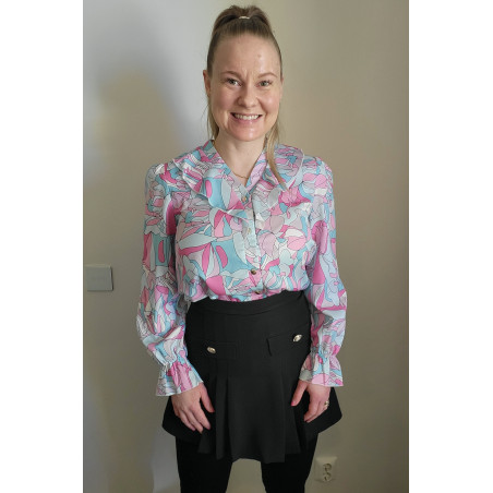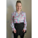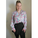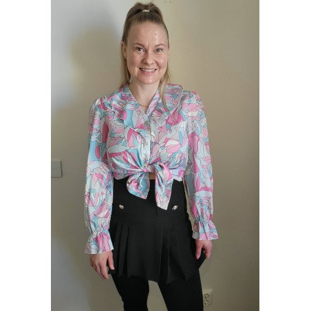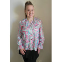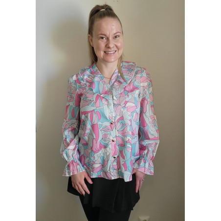 Värikäs printtikuvioinen pusero röyhelöillä