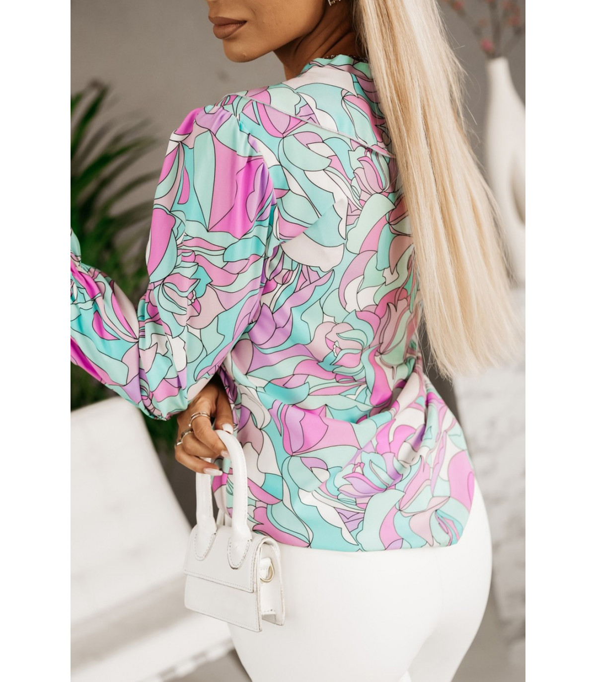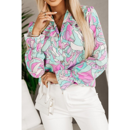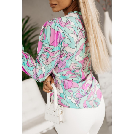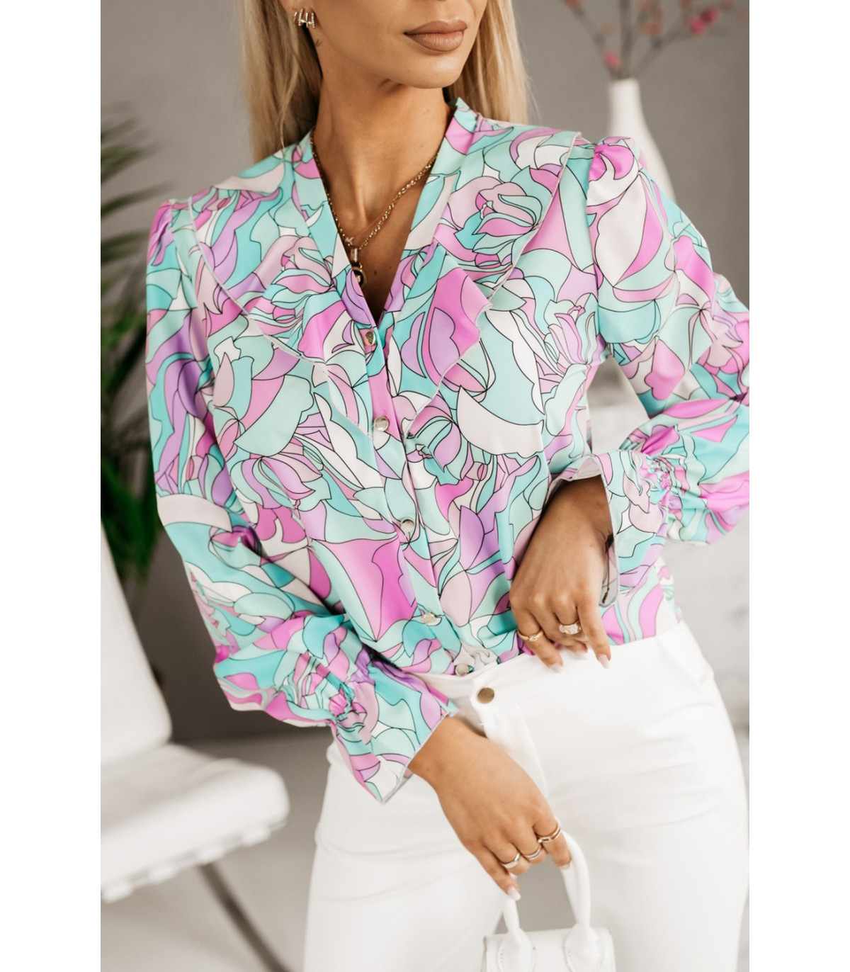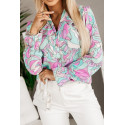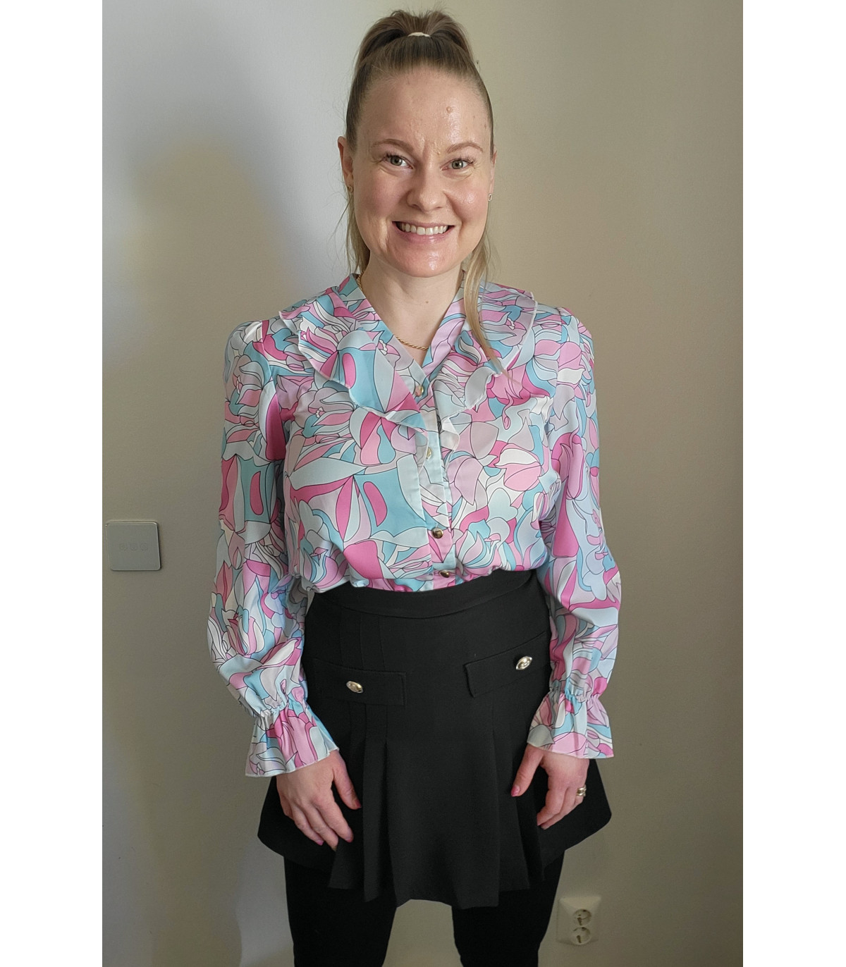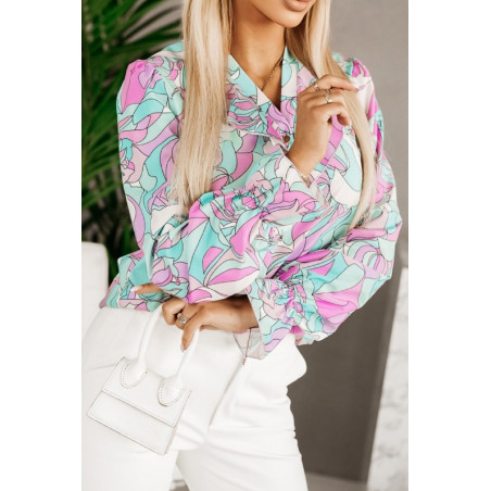 Värikäs printtikuvioinen pusero röyhelöillä