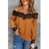 Okranvärinen pitkähihainen pitsikoristeinen olkapäät paljastava väljä pusero. Kaunis okra pusero pitsikoristeilla on loistava valinta moneen eri tilanteeseen, esimerkiksi treffeille tai illanistujaisiin. Tyylikäs pusero pitsisomisteilla on helppo yhdistää sekä housujen että hameiden kanssa.