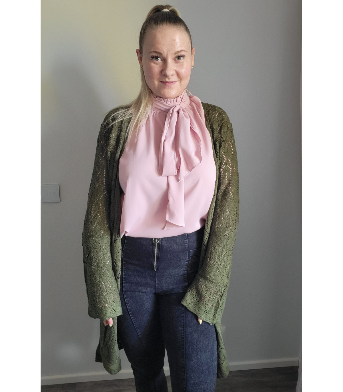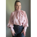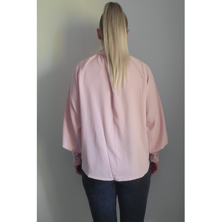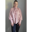 Vaaleanpunainen pussihihainen pusero rusettinauhoilla