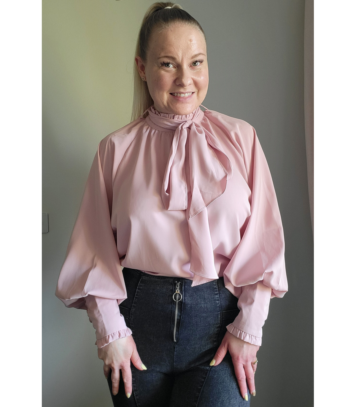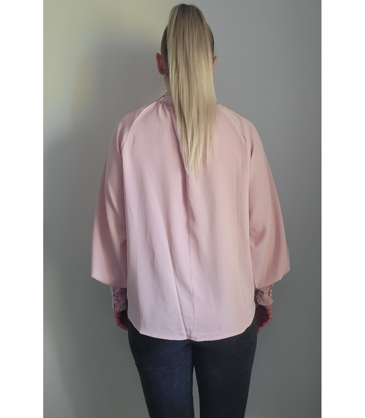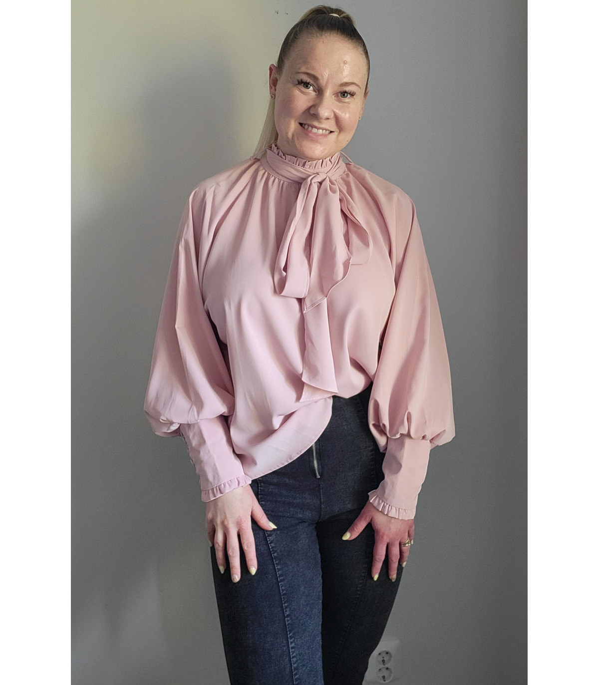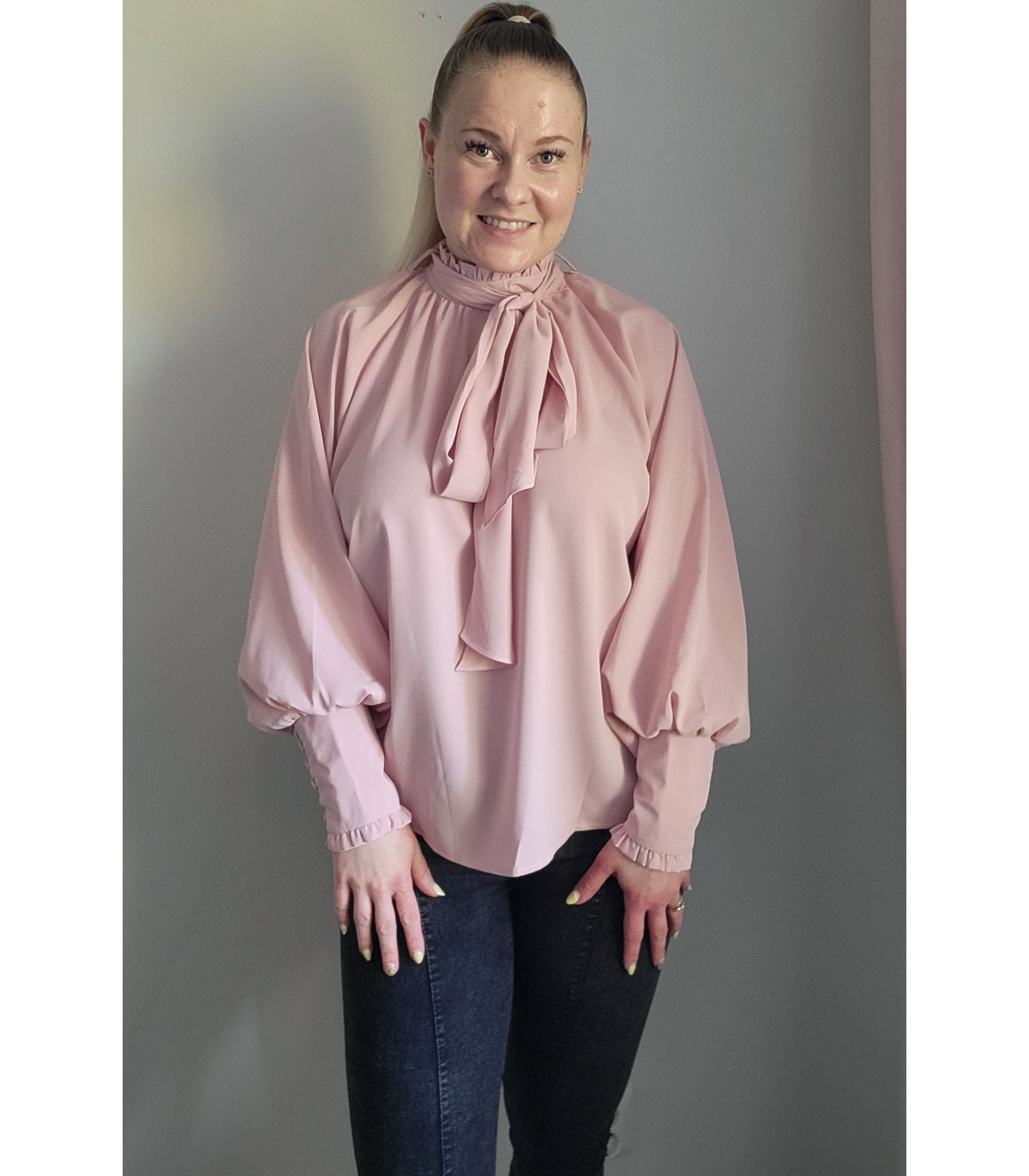 Plus de details Älä mieti liian pitkään - viimeinen kappale varastossa!Vaaleanpunainen pussihihainen pusero rusettinauhoilla