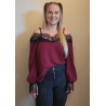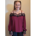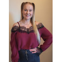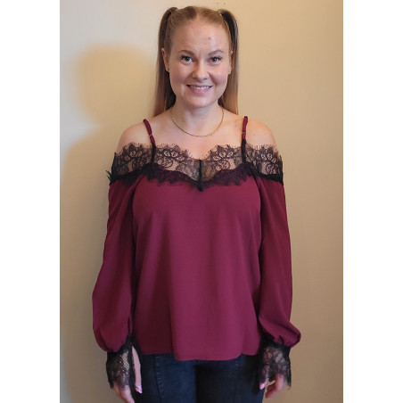 Viininpunainen pitsikoristeinen pusero olkahalkioilla