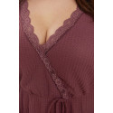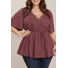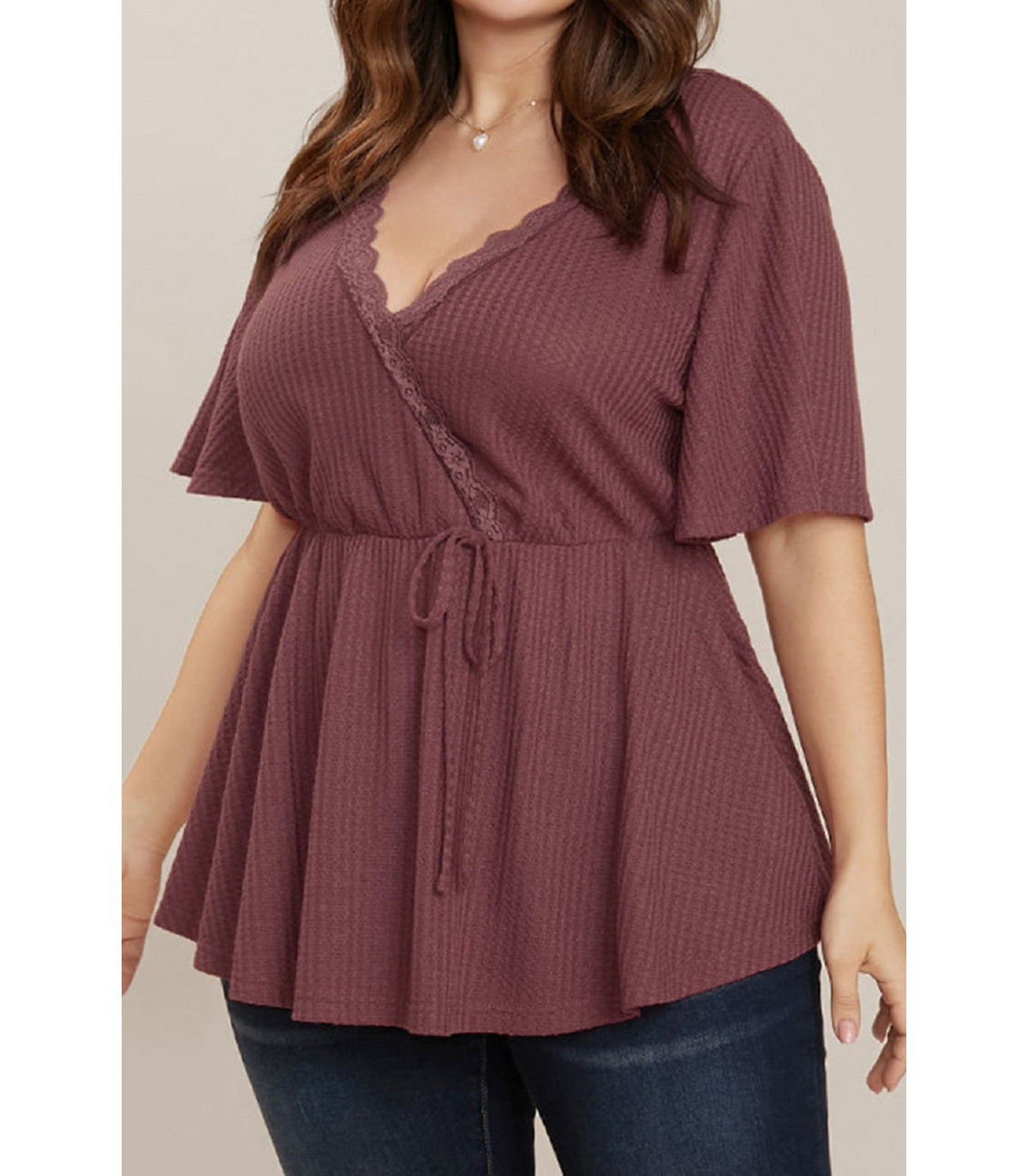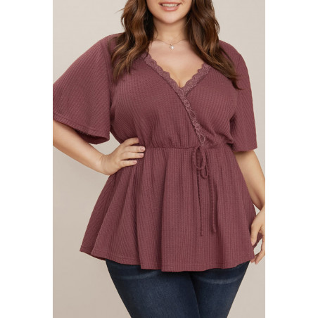 Ruskeanpunainen lyhythihainen v-vohvelipaita pitsillä (plus size)