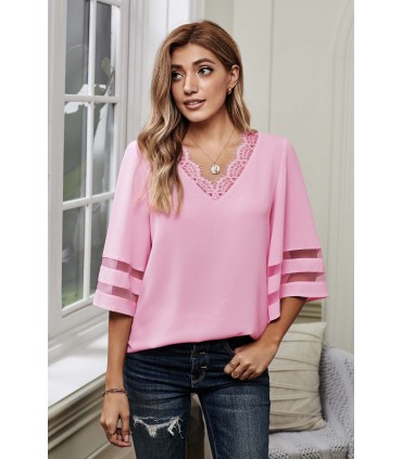 Plus de details Tuote saatavilla eri vaihtoehdoillaVaaleanpunainen mesh- ja pitsikoristeinen kellohihainen pusero