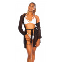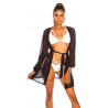 Musta pitkähihainen avonainen lyhyt rantakimono vyöllä. Läpikuultava musta kimono on kevyt rantavaate, joka on helppo vetäistä rannalla uima-asun suojaksi. Monikäyttöinen kimono sopii moneen eri käyttöön, esimerkiksi ranta-asuksi, paidaksi osana kesätyyliä tai aamutakiksi. Yksivärinen kimono on helppo yhdistää eri väreihin. Musta kimono on aina varma valinta ja se sopii kaikkien värien kanssa. Näyttävät remmikoristeiset bikinit myydään erikseen.